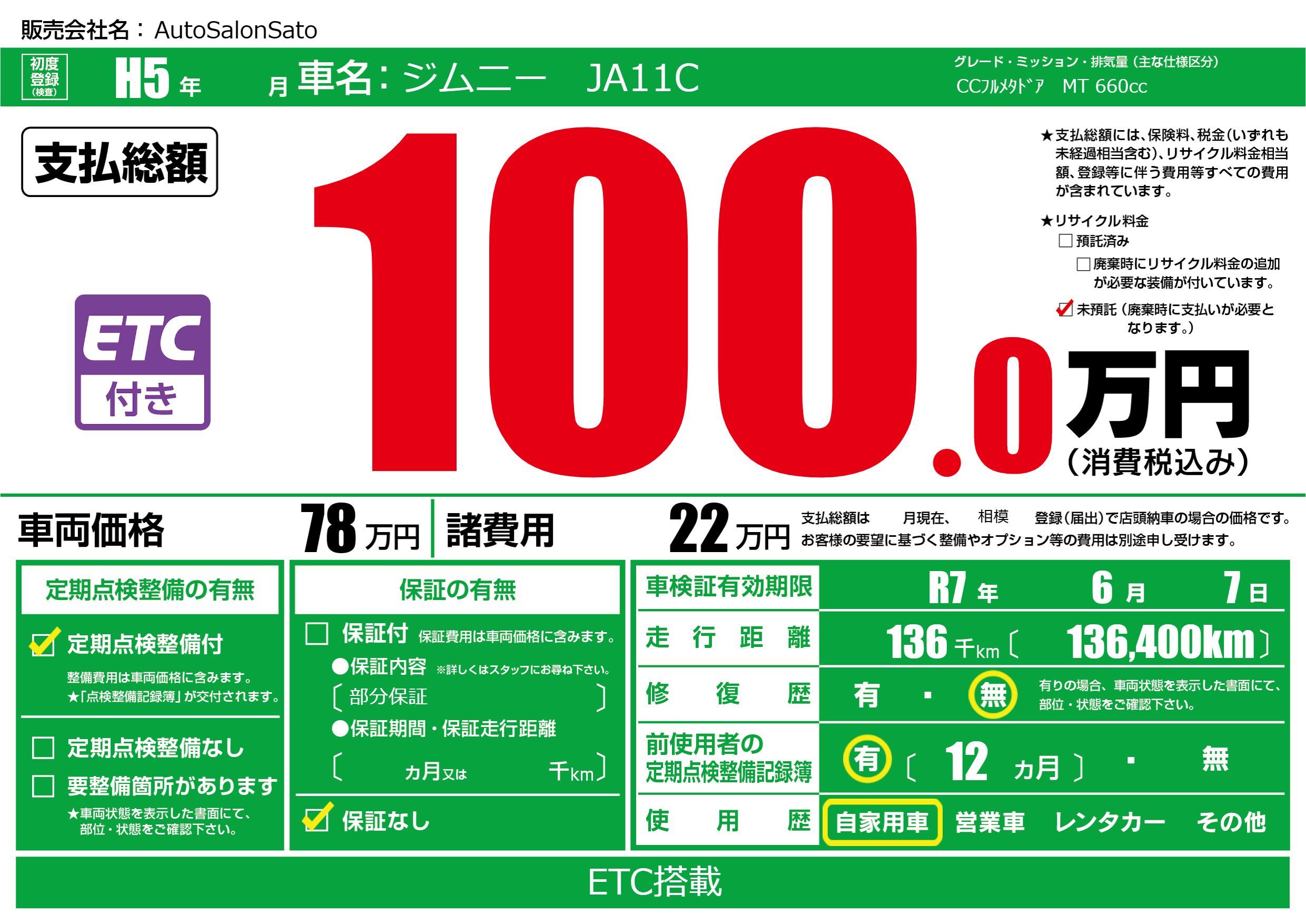 | 車名 | ジムニー JA11C | グレード ミッション 排気量 |
