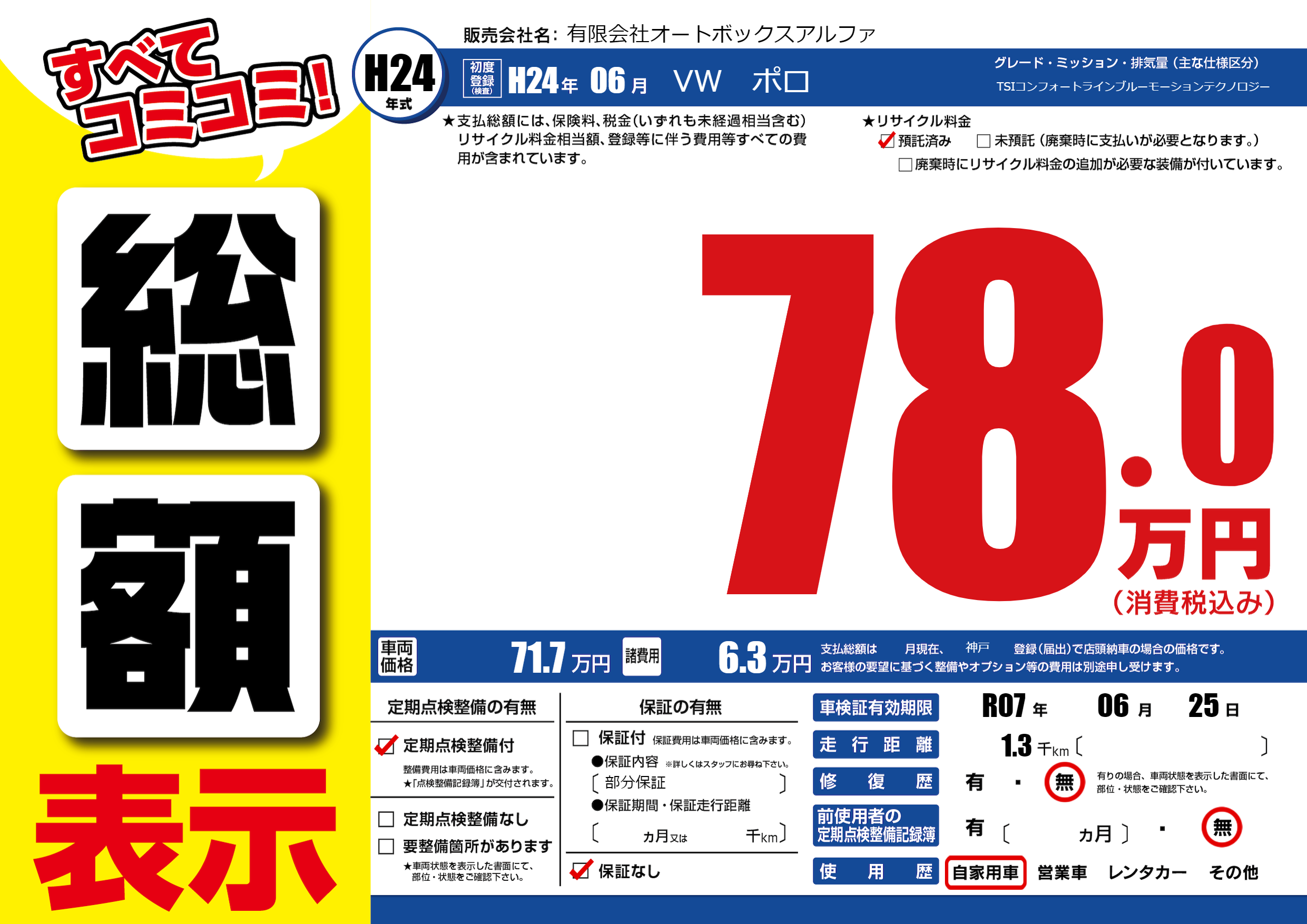 | 車名 | VW ポロ | グレード ミッション 排気量 |