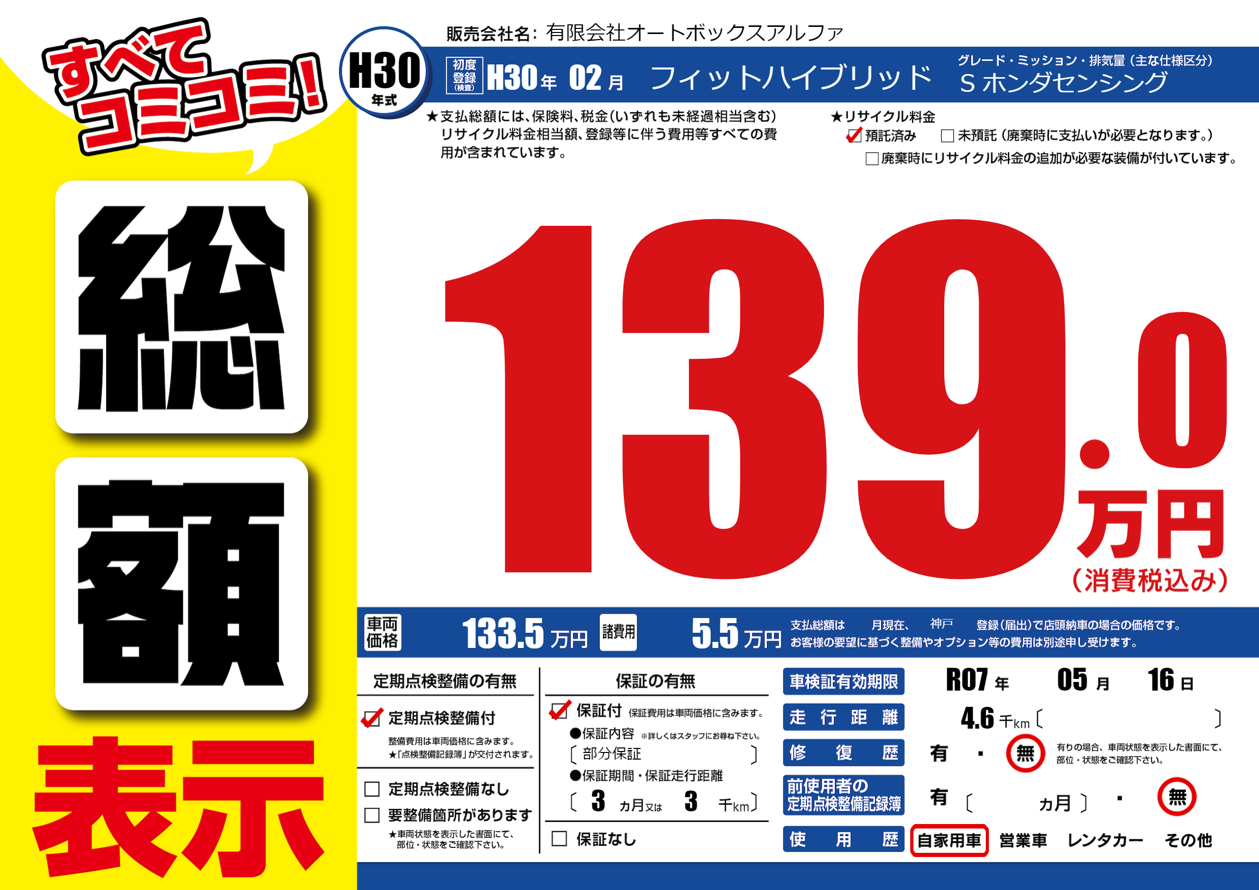 | 走行キロ | 0.4万km | 初年度登録 | H30年02月 |