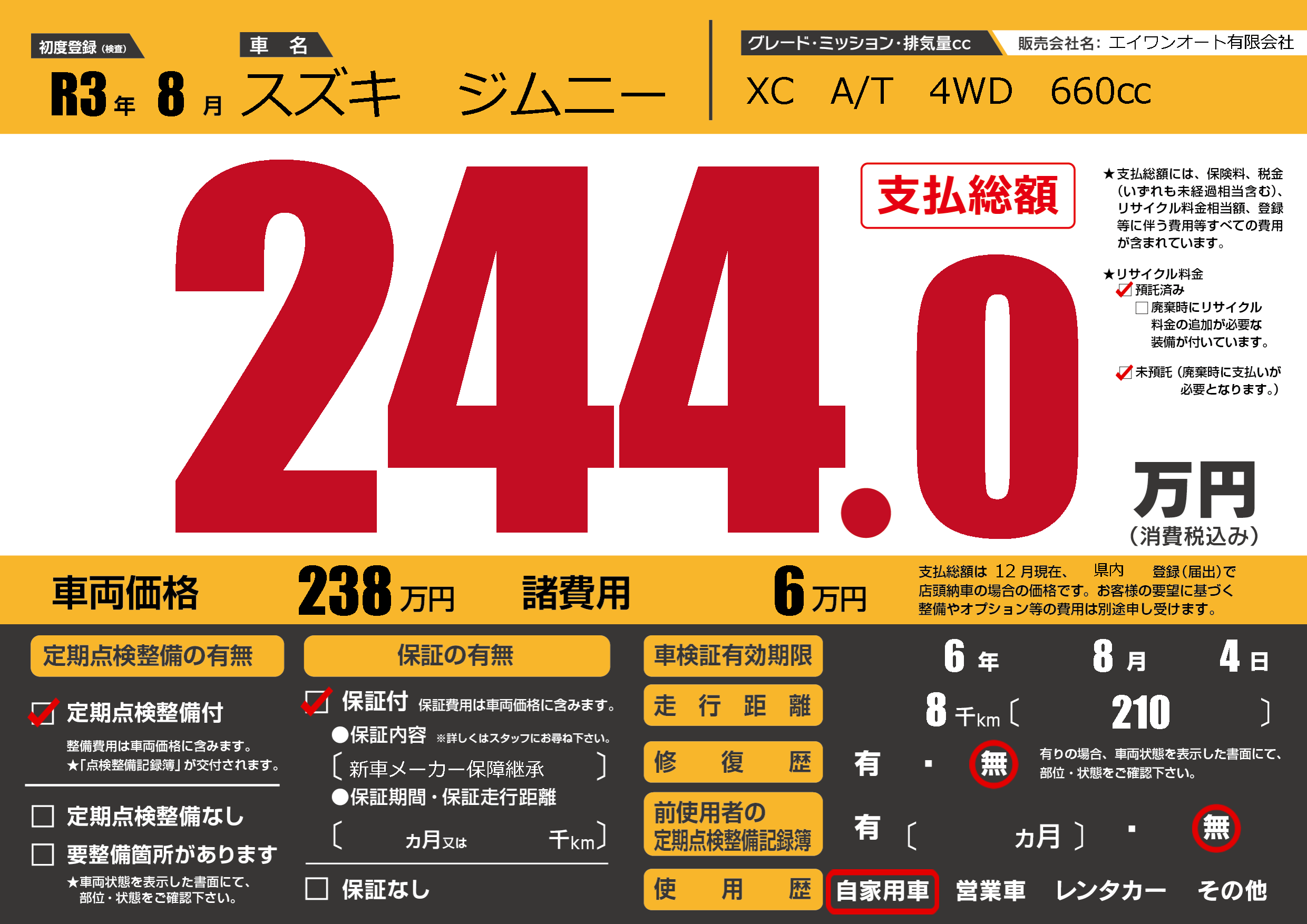 | 走行キロ | 0.8万km | 初年度登録 | R3年8月 |
