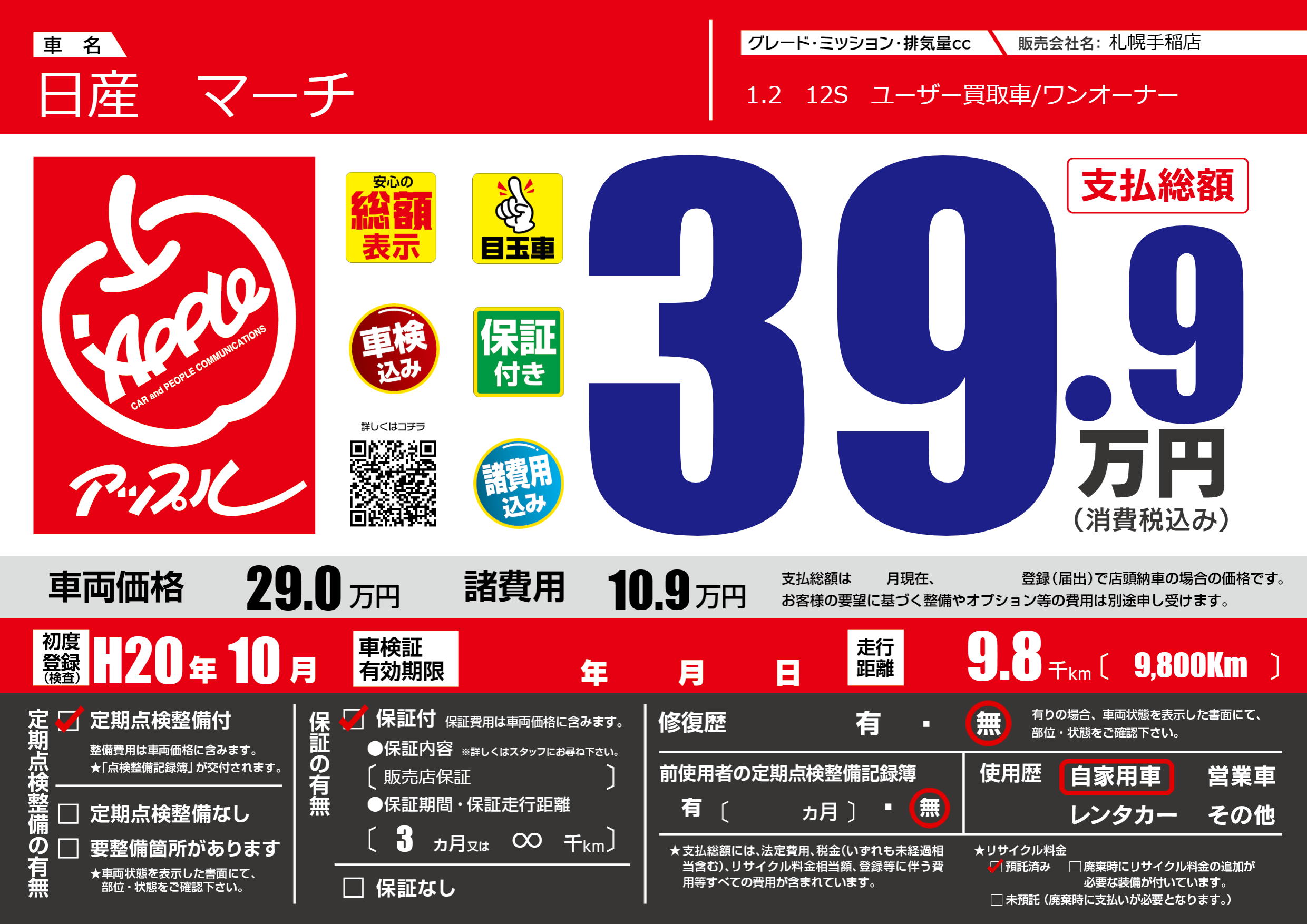 | 車名 | 日産 マーチ | グレード ミッション 排気量 |