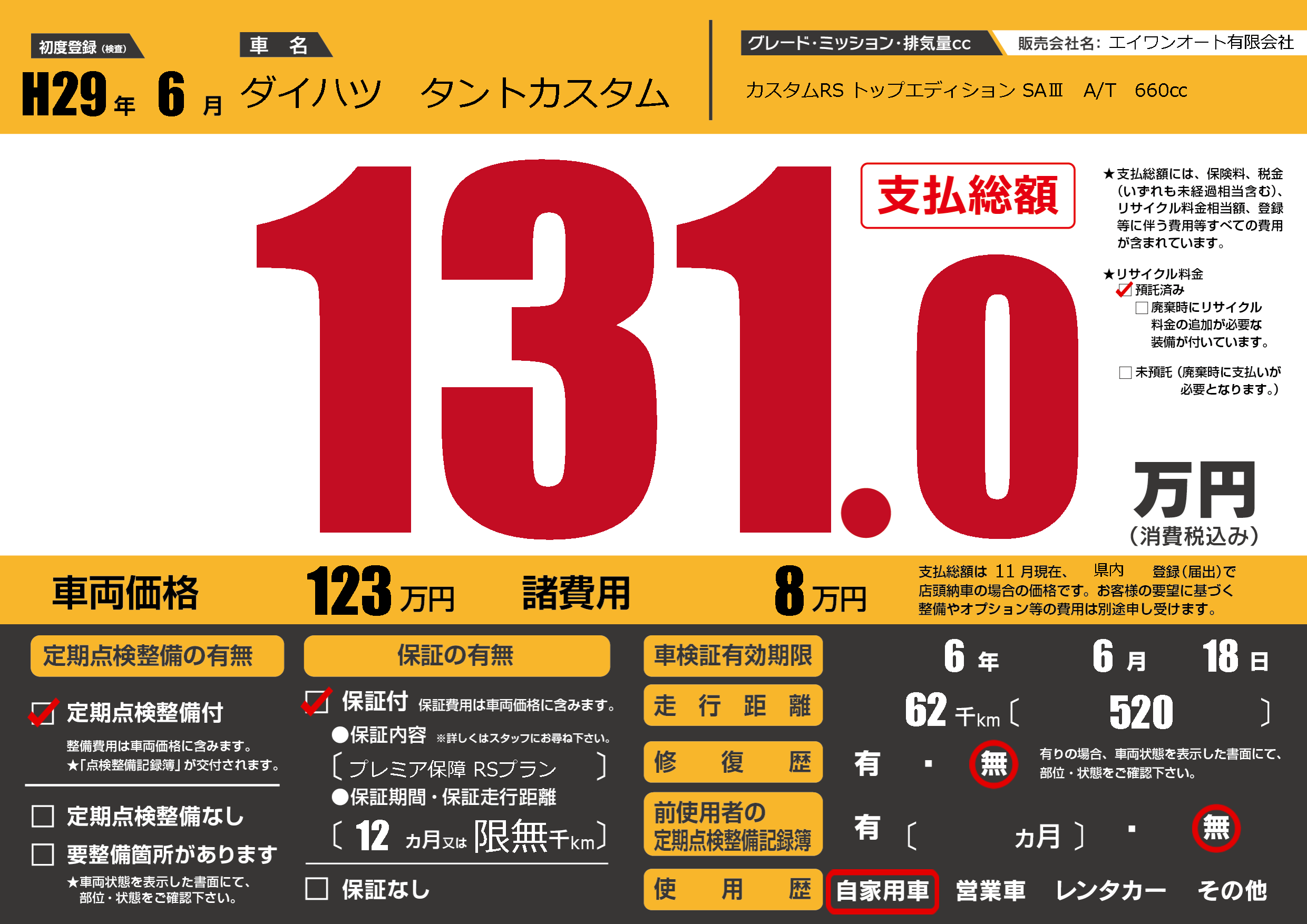 | 車名 | ダイハツ タントカスタム | グレード ミッション 排気量 |