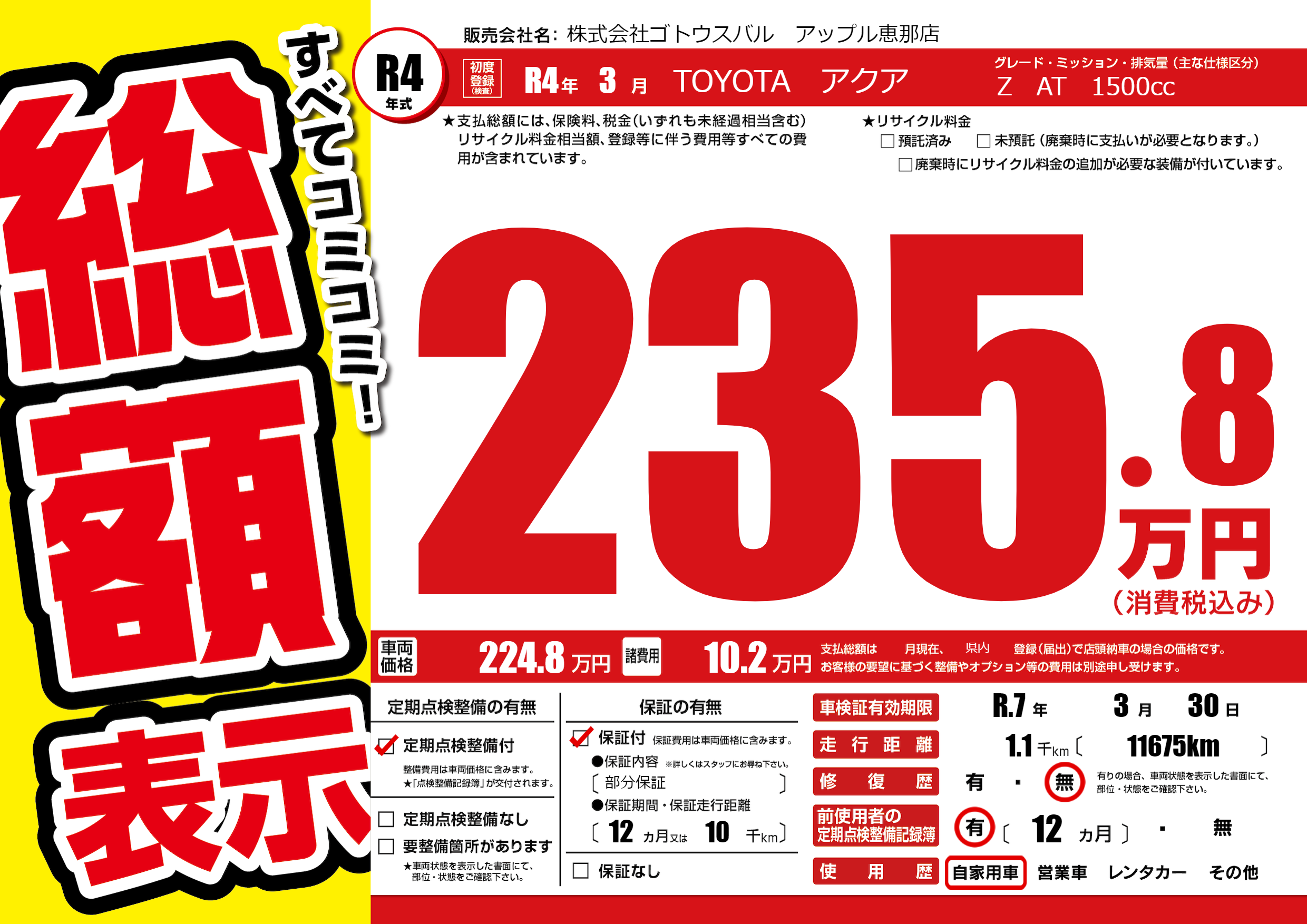 なし | 車検制限 | R.7年3月30月 |