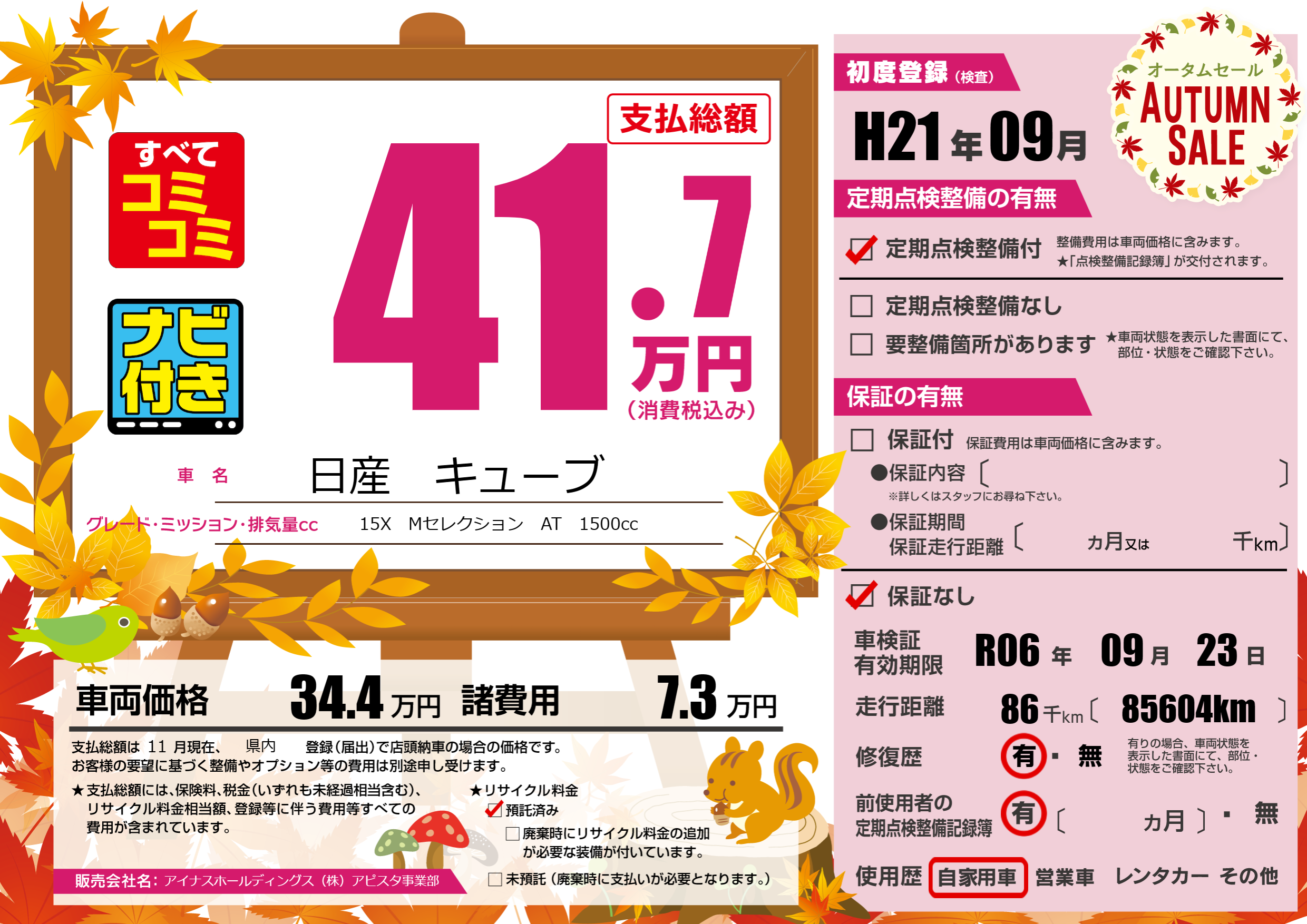 | 車名 | 日産 キューブ | グレード ミッション 排気量 |