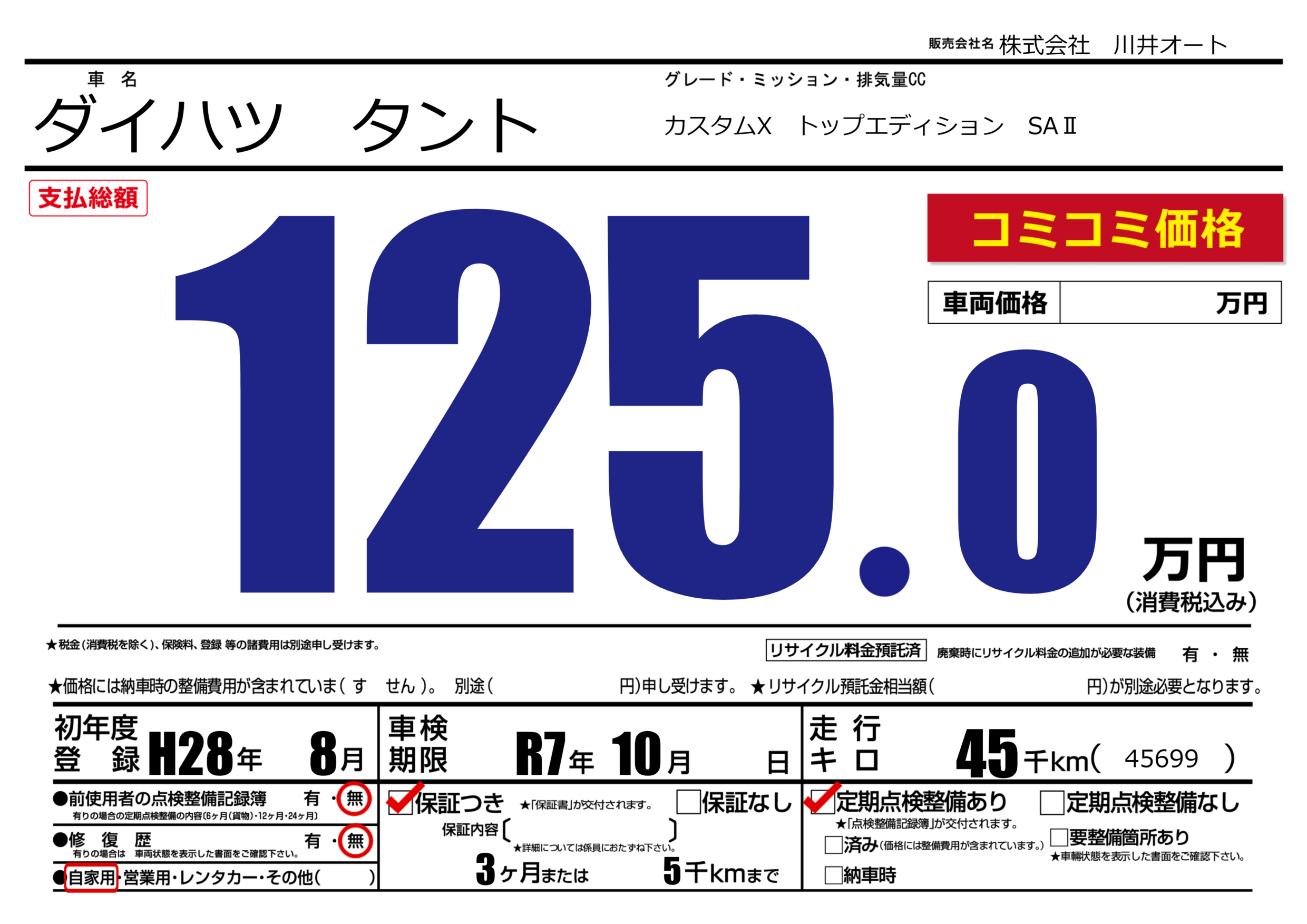 | 車名 | ダイハツ タント | グレード ミッション 排気量 |
