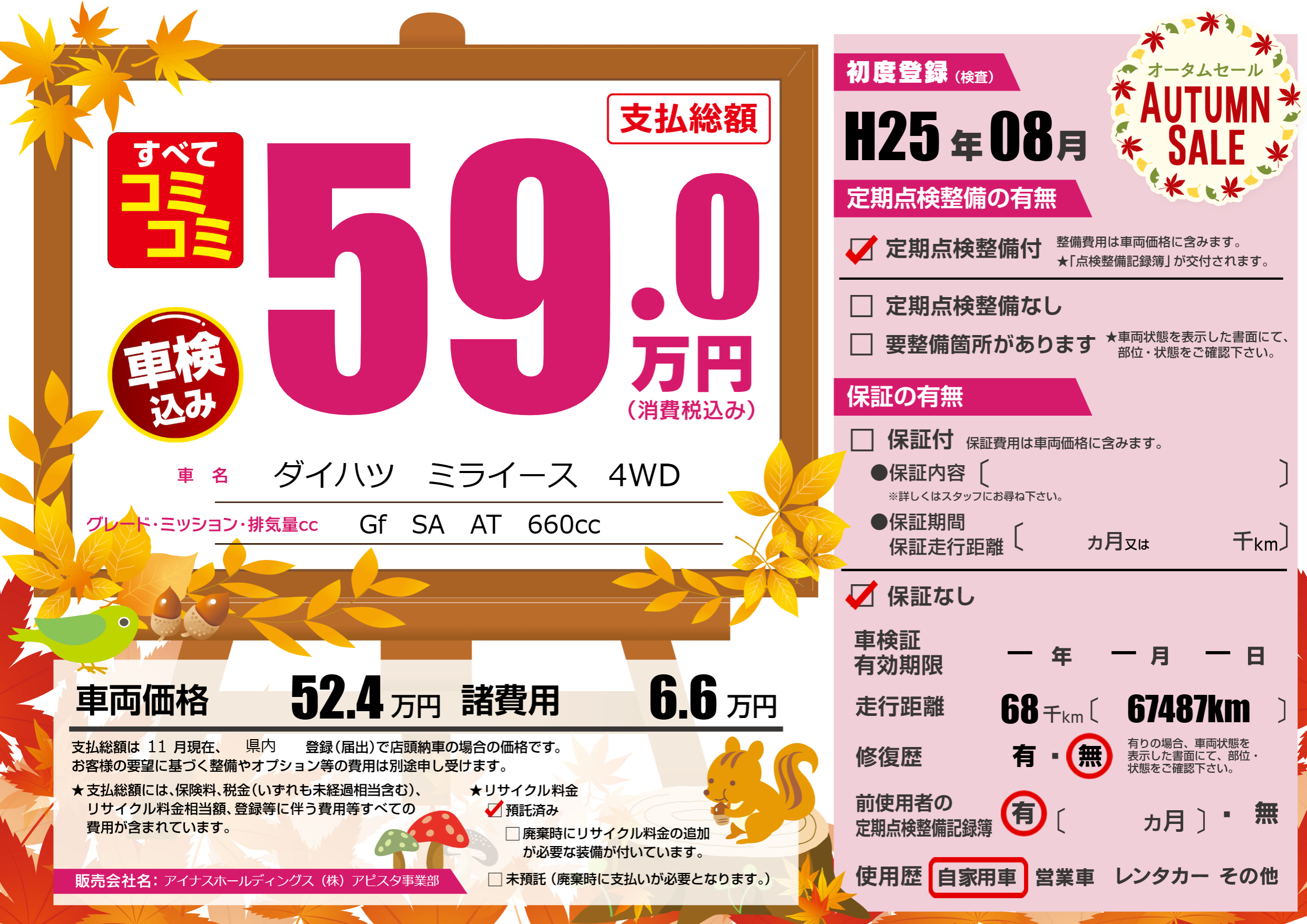| 走行キロ | 6.8万km | 初年度登録 | H25年08月 |