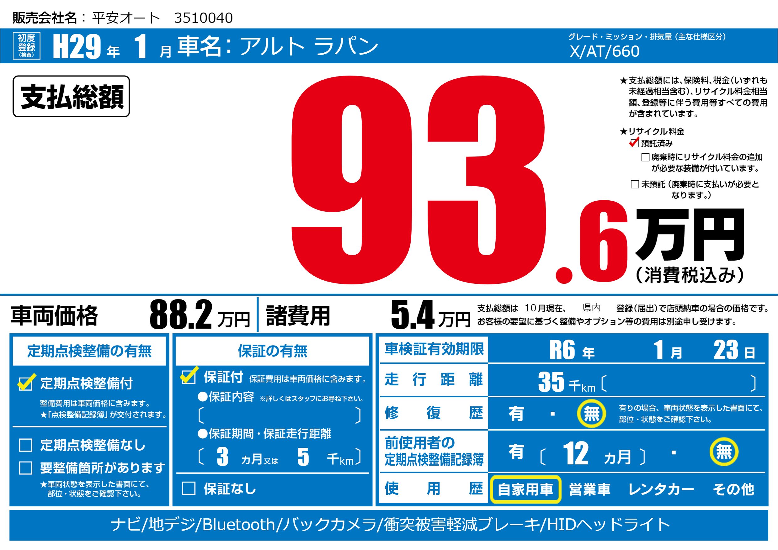なし | 車検制限 | R6年1月23月 |