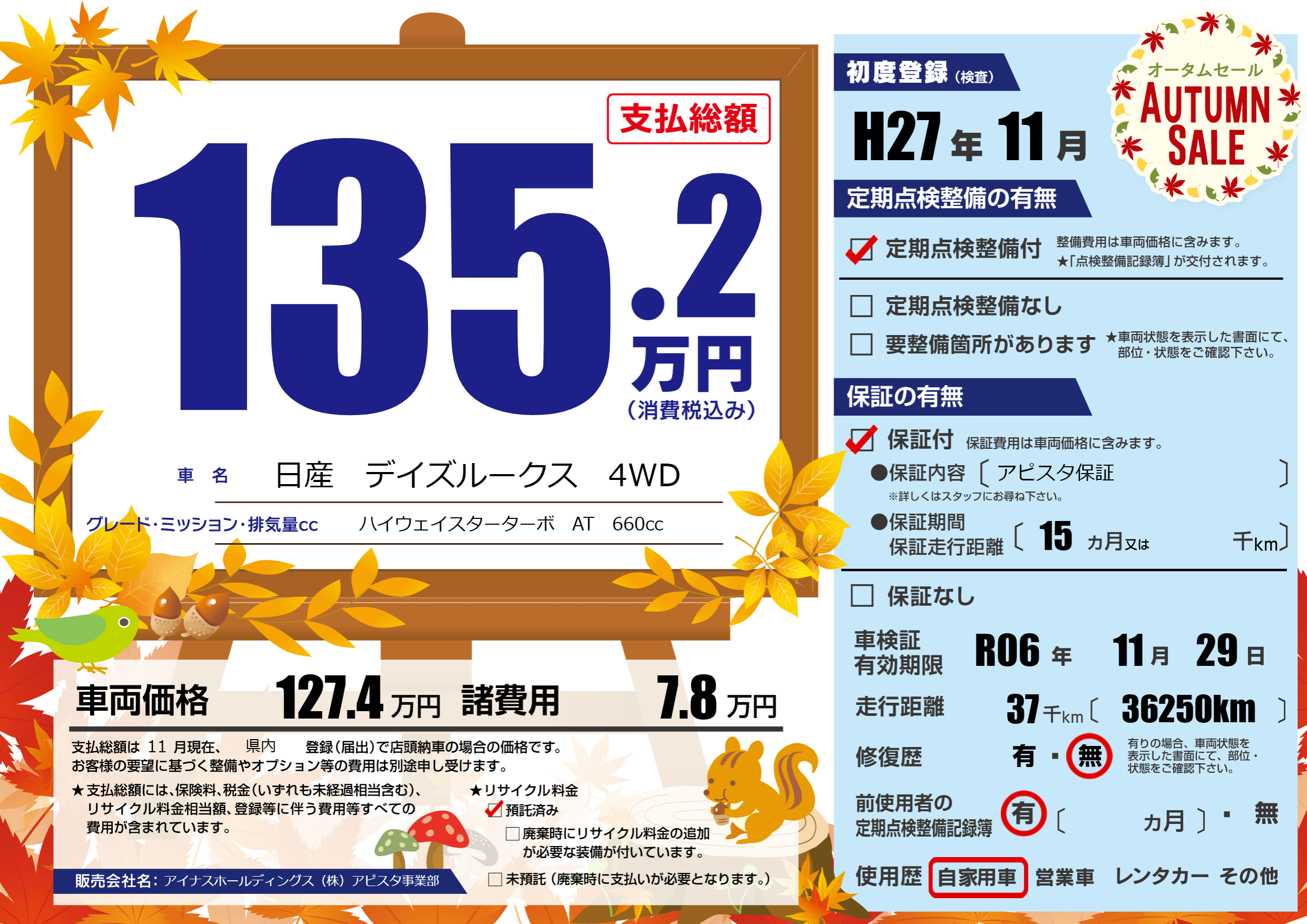 | 車名 | 日産 デイズルークス 4WD | グレード ミッション 排気量 |
