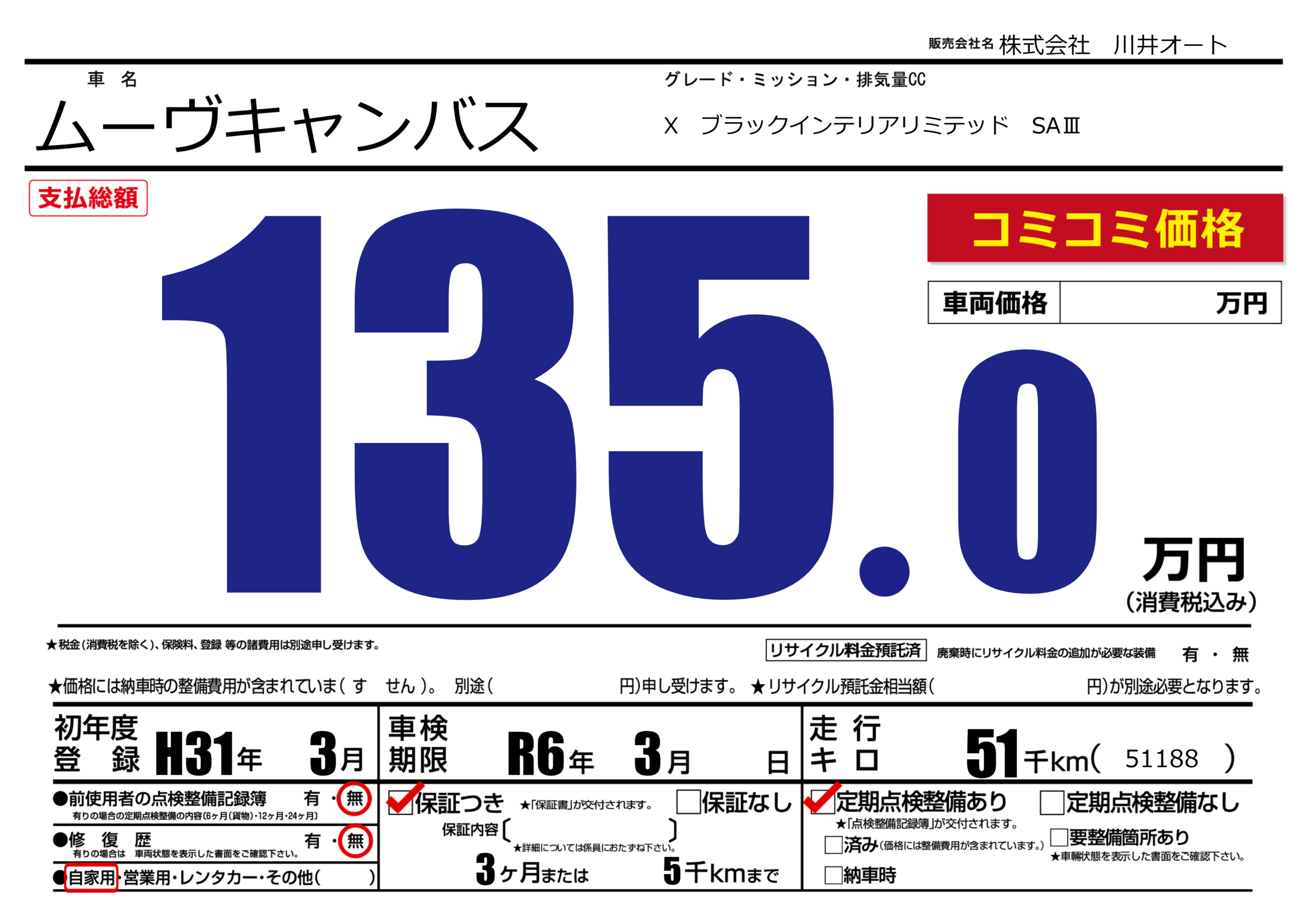 | 車名 | ムーヴキャンバス | グレード ミッション 排気量 |