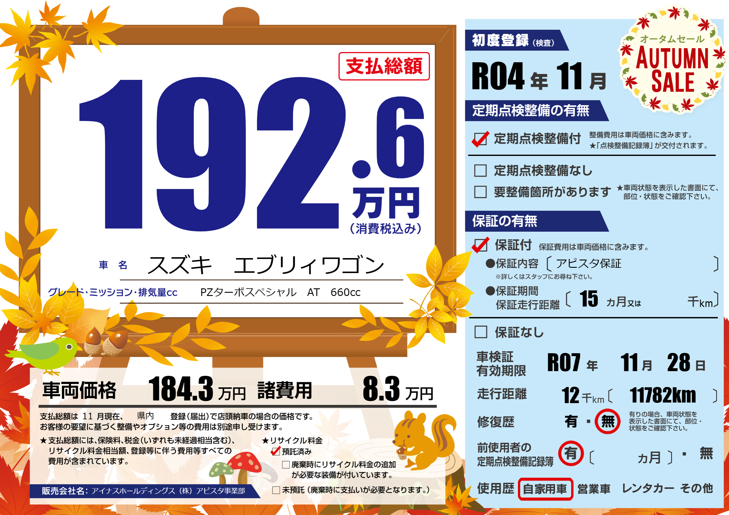 | 車名 | スズキ エブリィワゴン | グレード ミッション 排気量 |