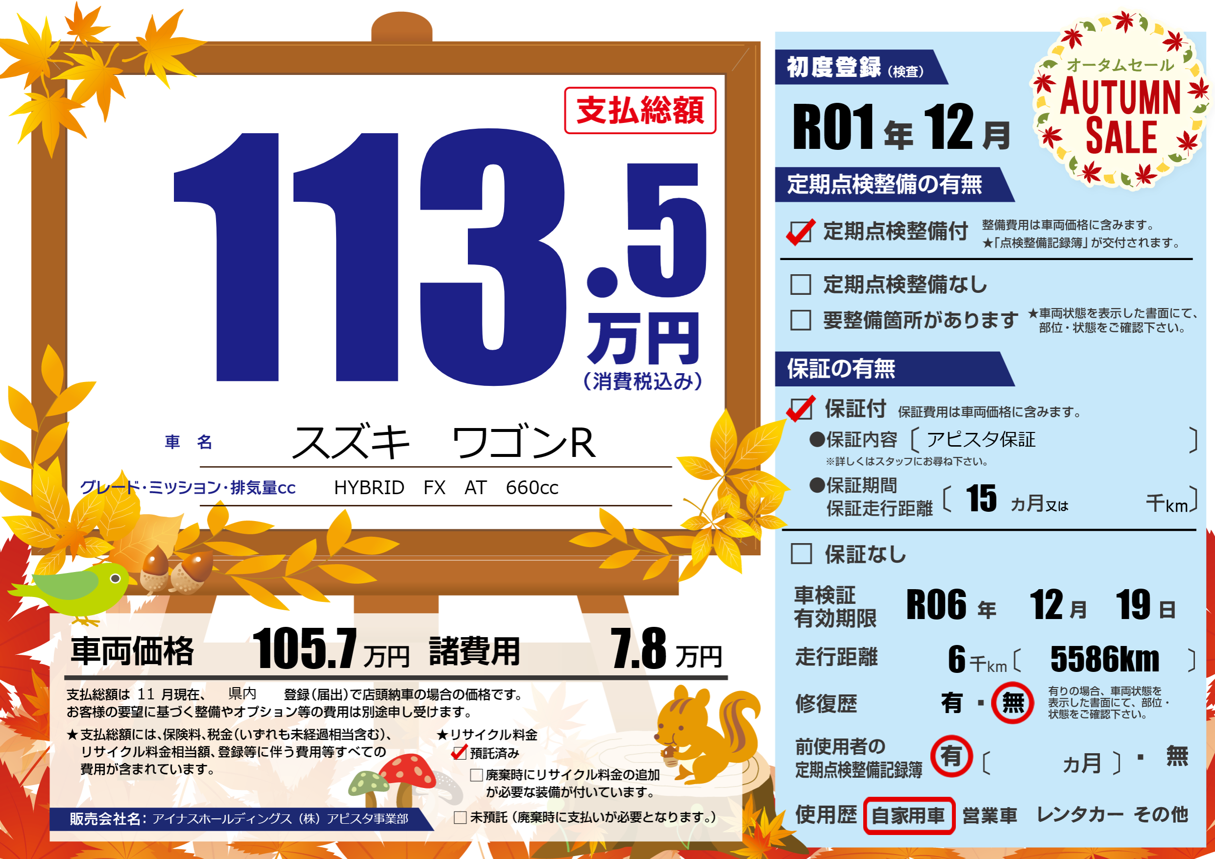 | 走行キロ | 0.6万km | 初年度登録 | R01年12月 |