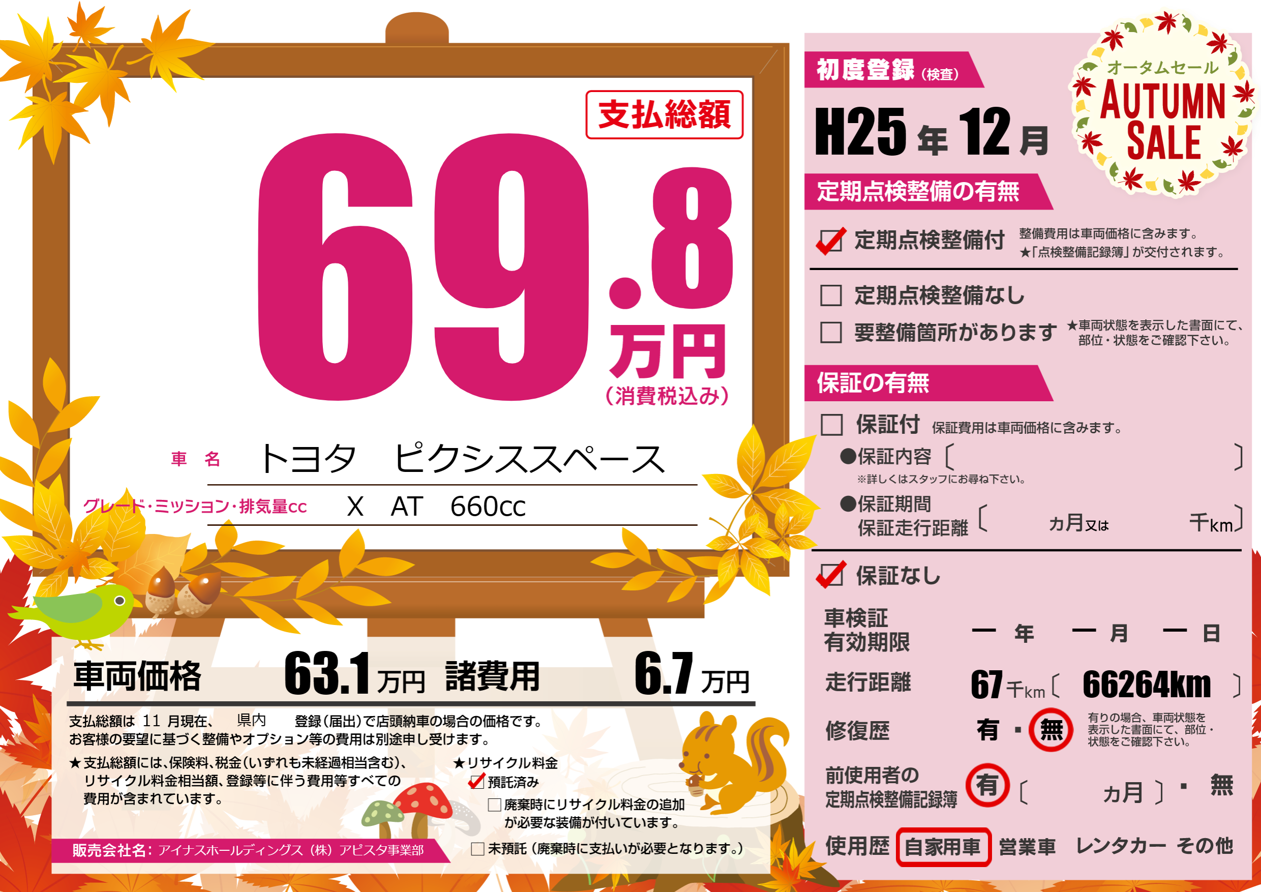 | 車名 | トヨタ ピクシススペース | グレード ミッション 排気量 |