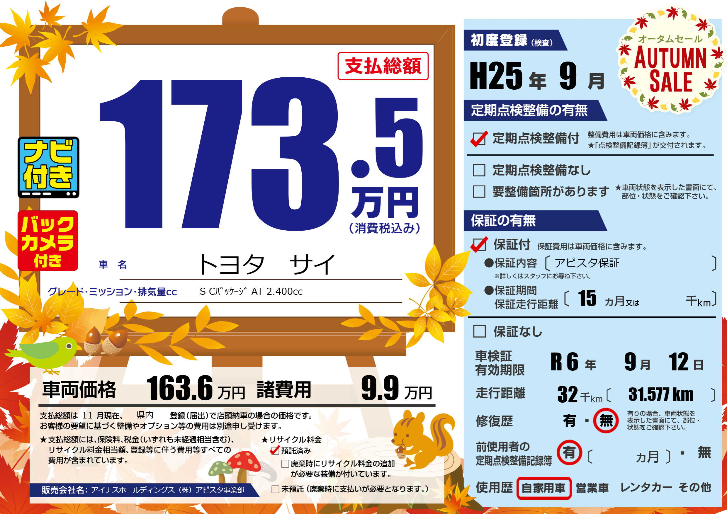 | 車名 | トヨタ サイ | グレード ミッション 排気量 |