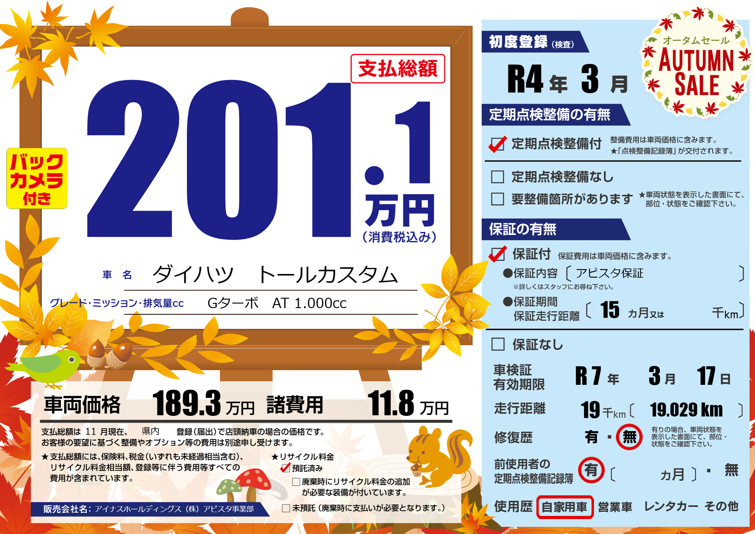 | 車名 | ダイハツ トールカスタム | グレード ミッション 排気量 |
