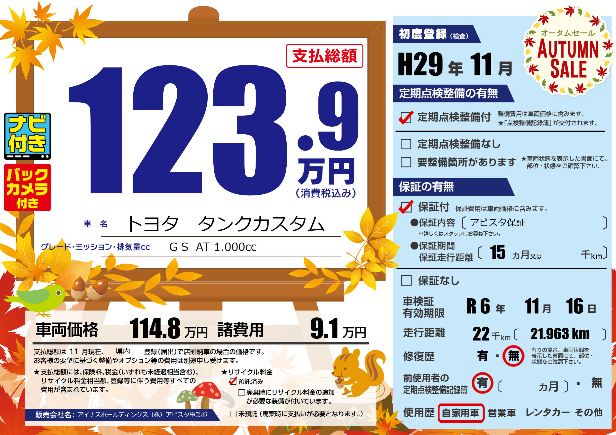 | 車名 | トヨタ タンクカスタム | グレード ミッション 排気量 |