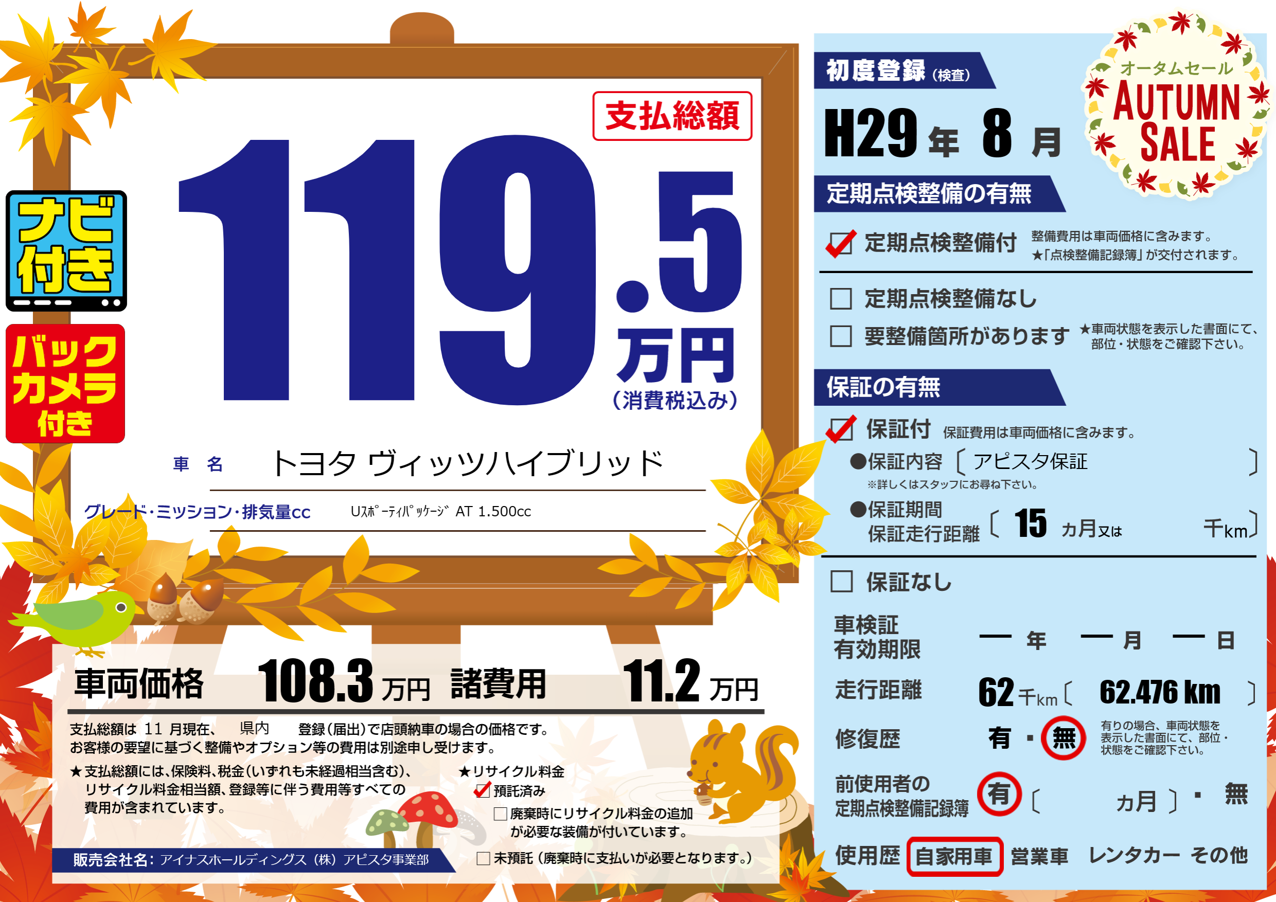| 走行キロ | 6.2万km | 初年度登録 | H29年8月 |