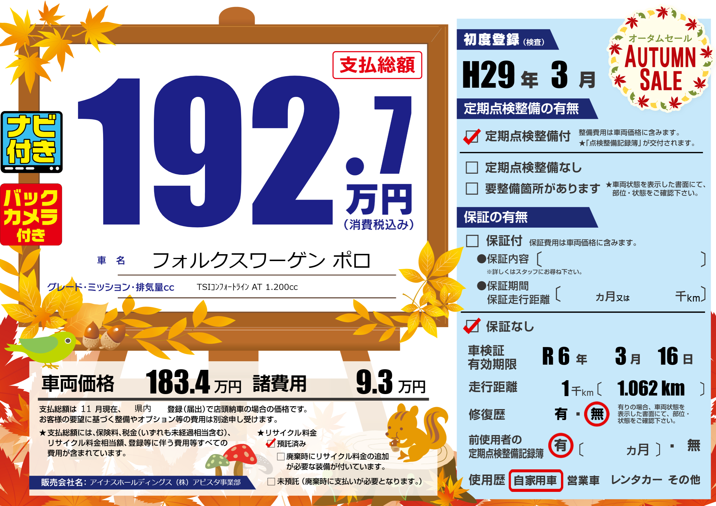 | 車名 | フォルクスワーゲン ポロ | グレード ミッション 排気量 |