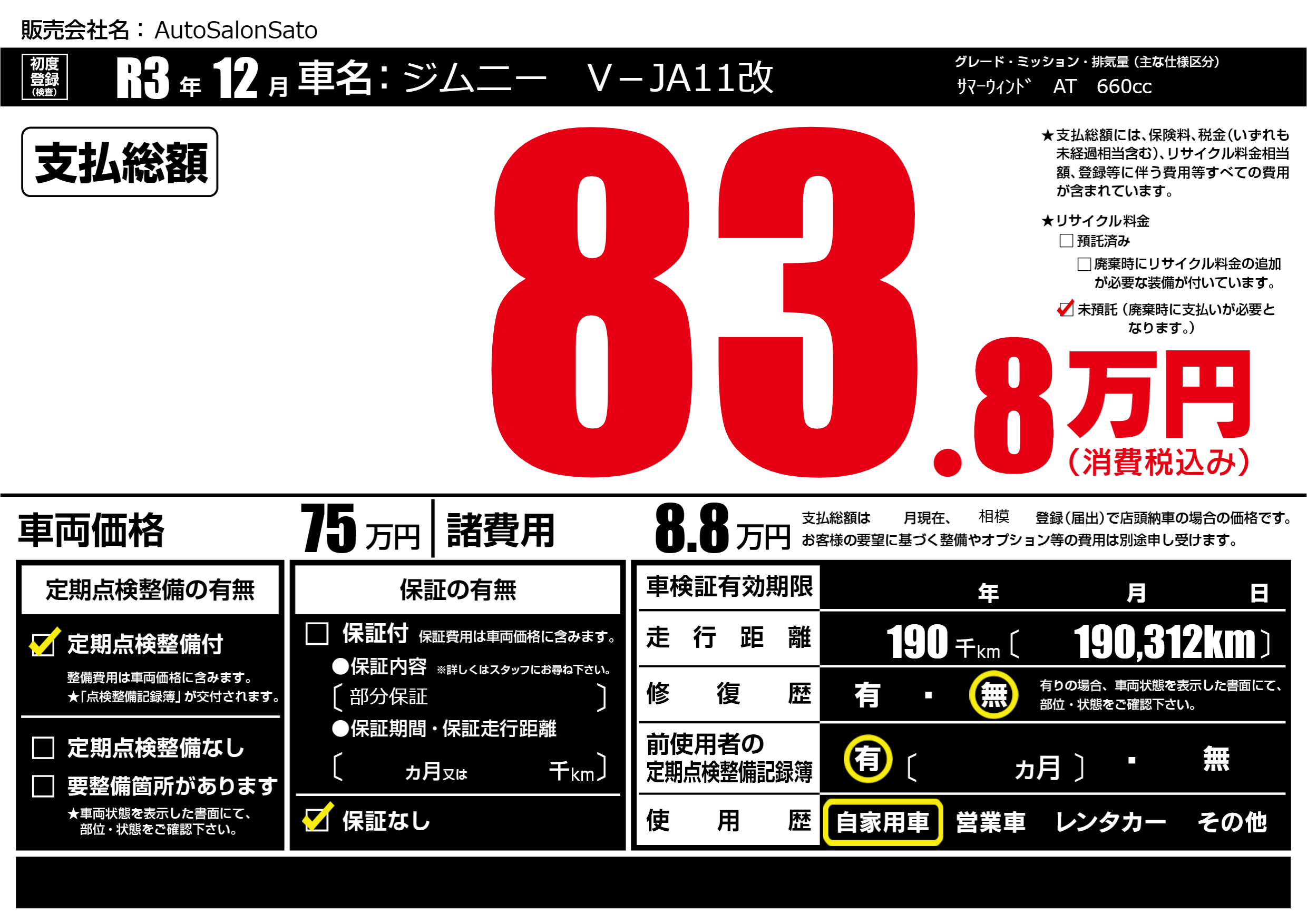 | 走行キロ | 19万km | 初年度登録 | R3年12月 |