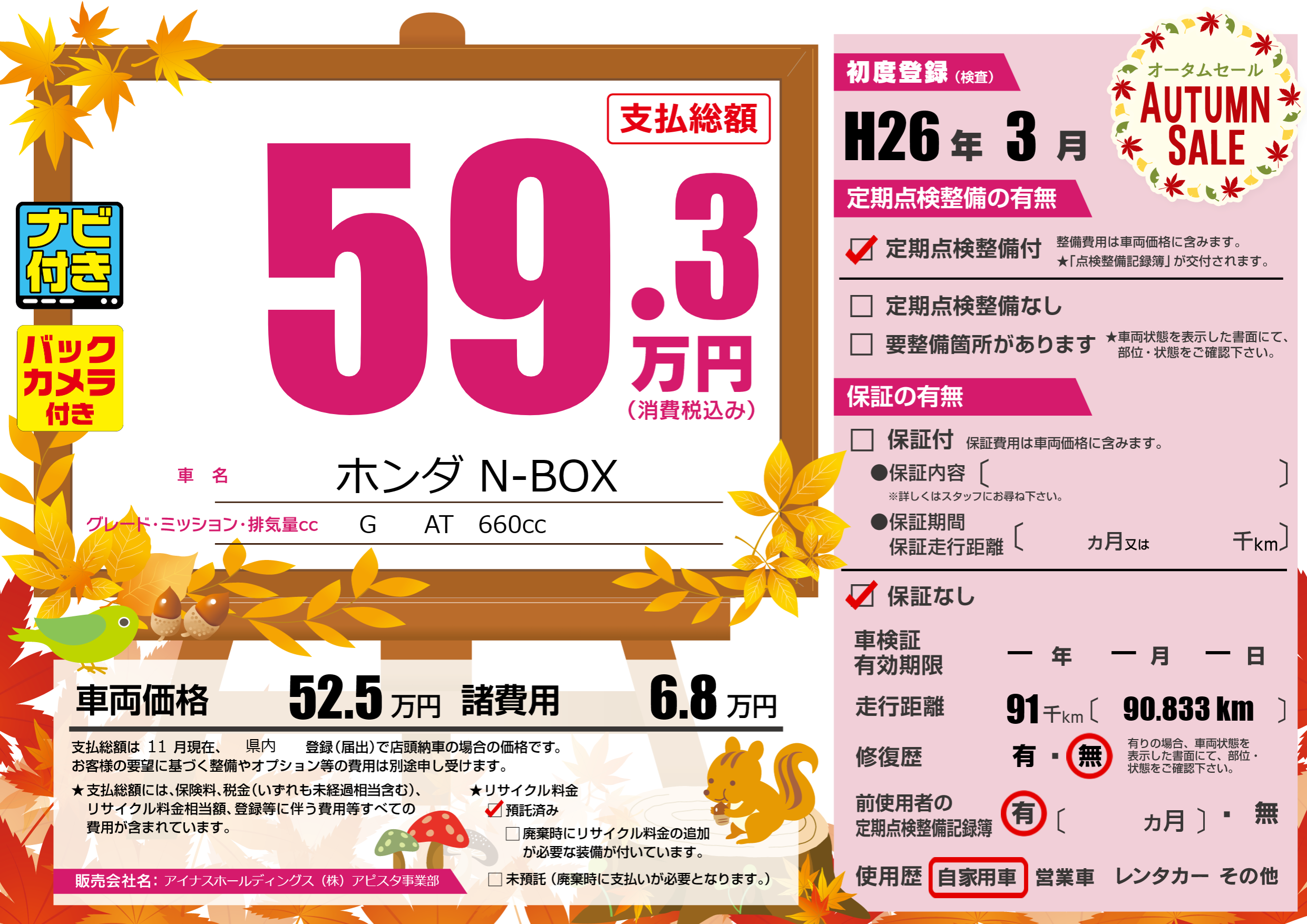 | 走行キロ | 9.1万km | 初年度登録 | H26年3月 |