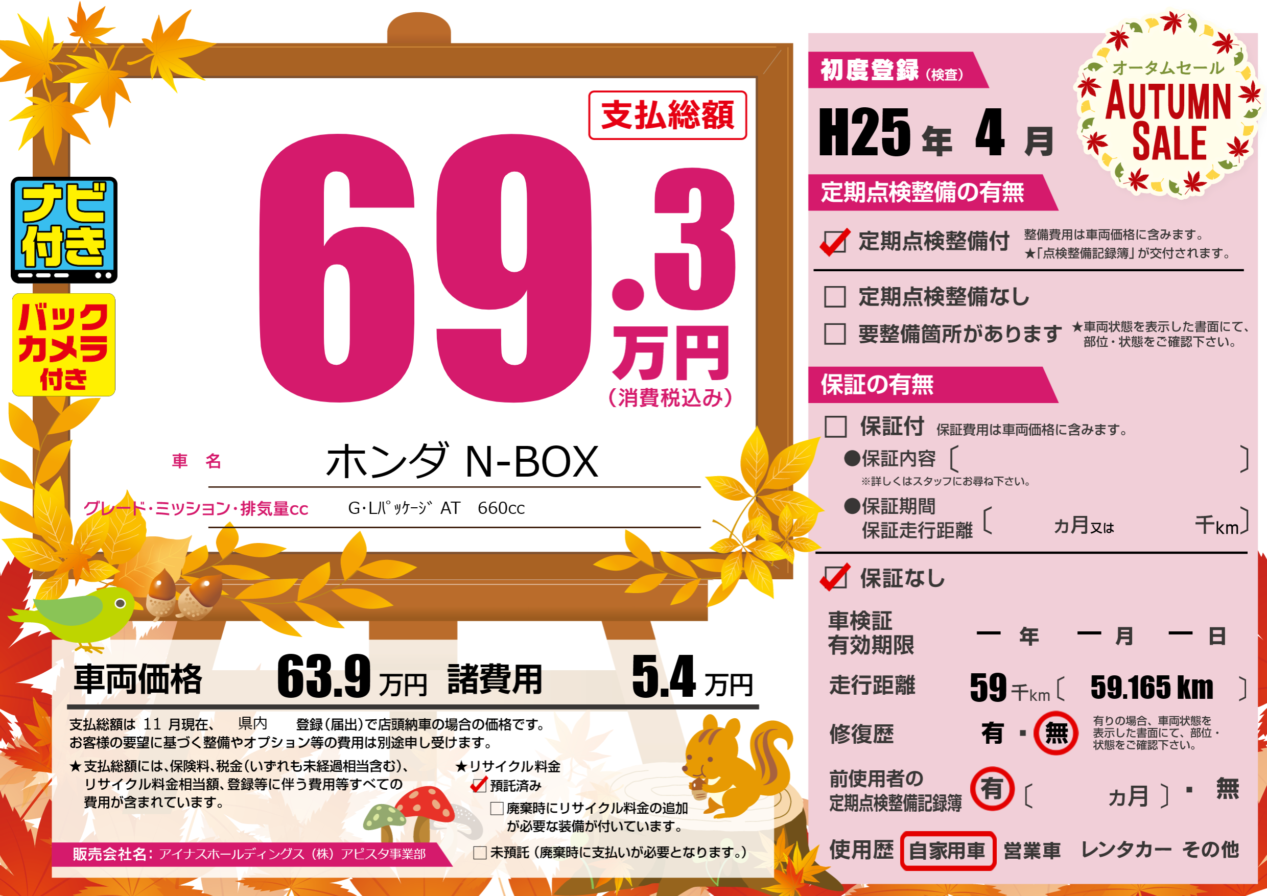 | 車名 | ホンダ N-BOX | グレード ミッション 排気量 |