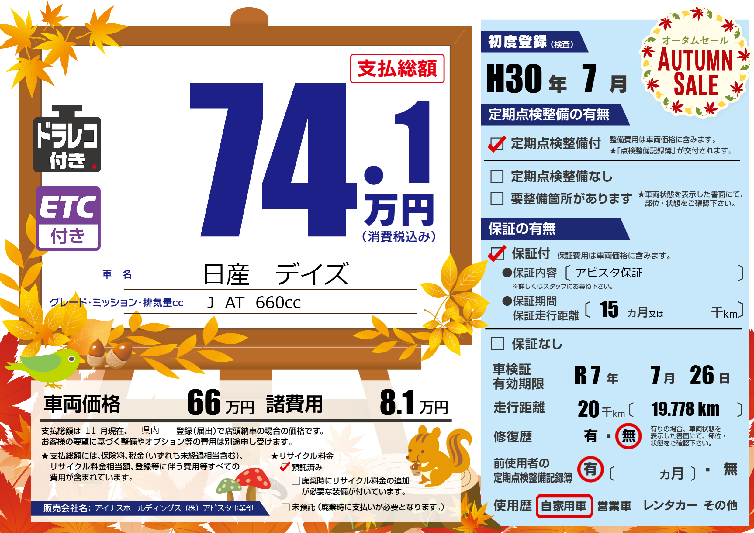 | 車名 | 日産 デイズ | グレード ミッション 排気量 |