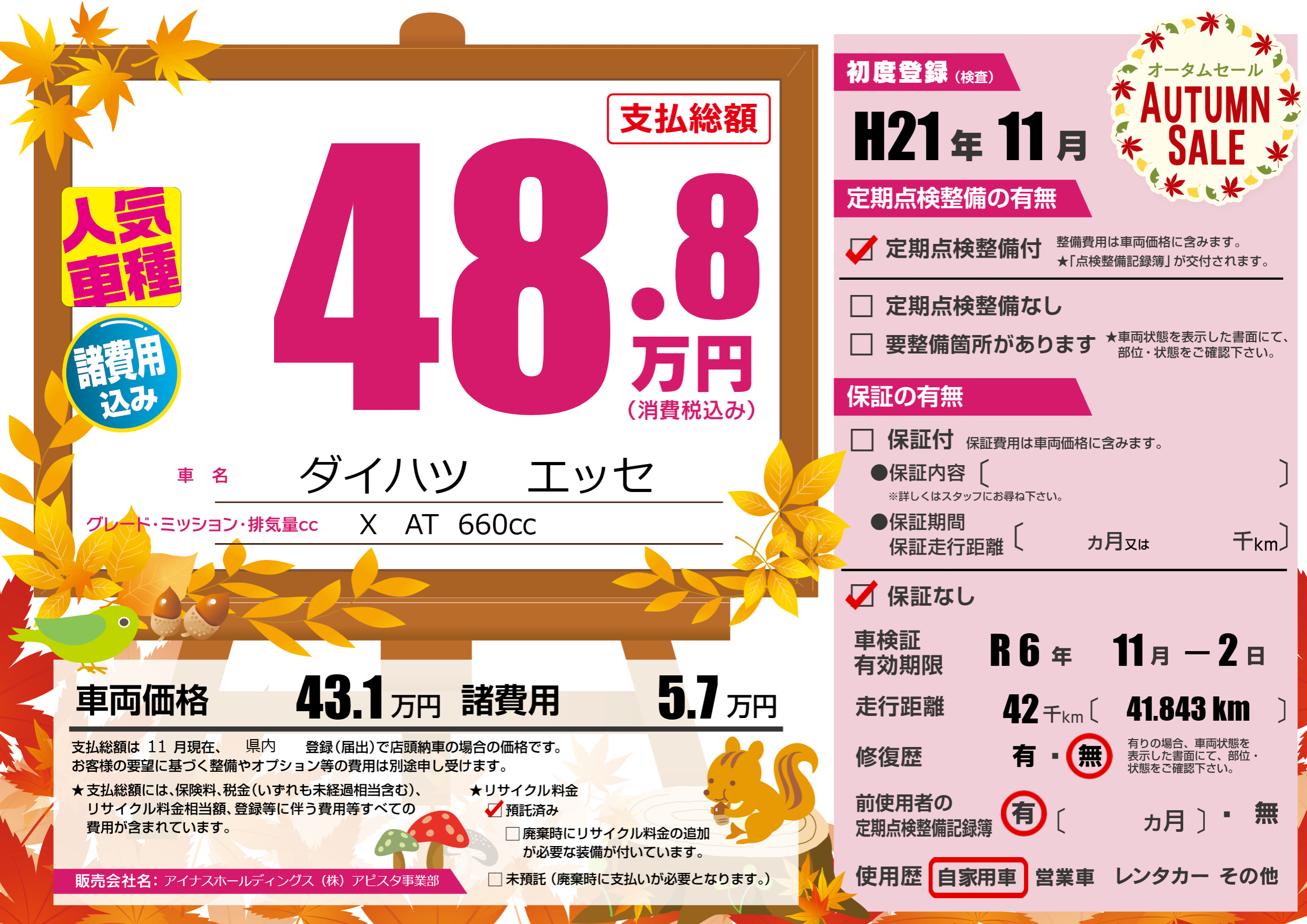 | 車名 | ダイハツ エッセ | グレード ミッション 排気量 |