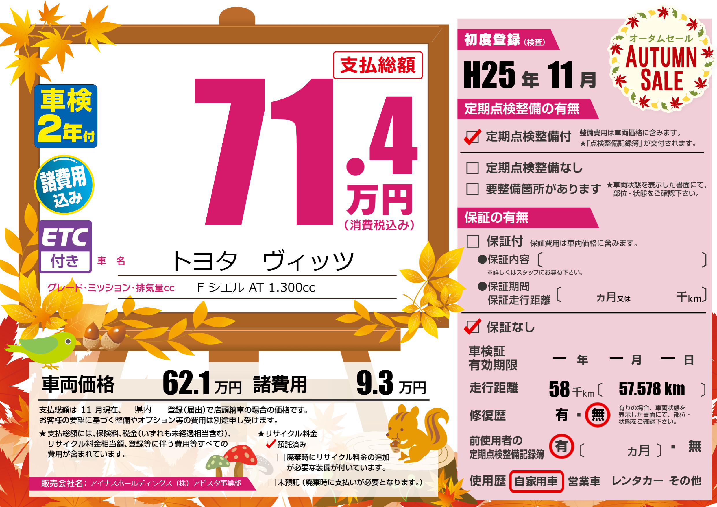 | 車名 | トヨタ ヴィッツ | グレード ミッション 排気量 |