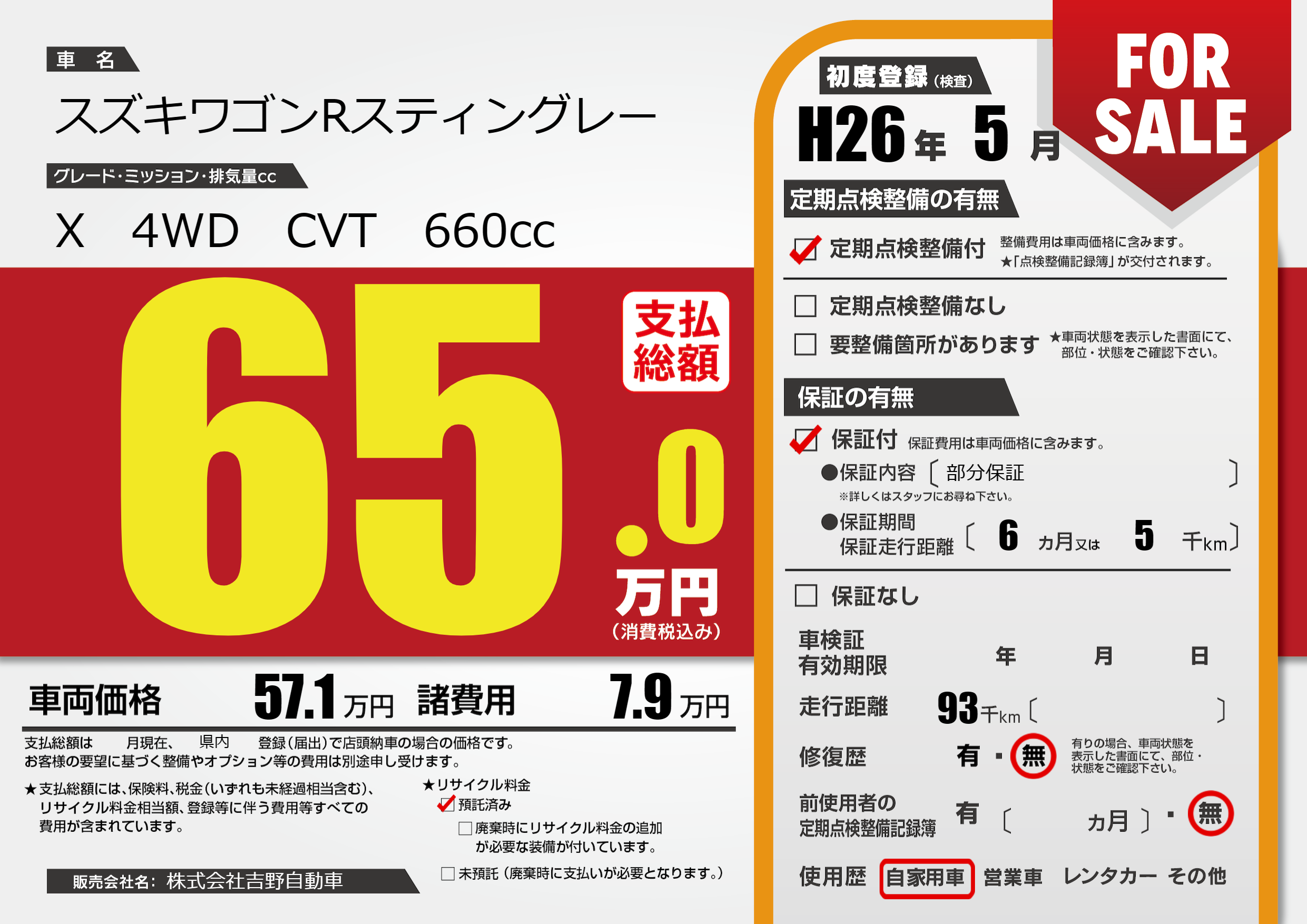 | 走行キロ | 9.3万km | 初年度登録 | H26年5月 |