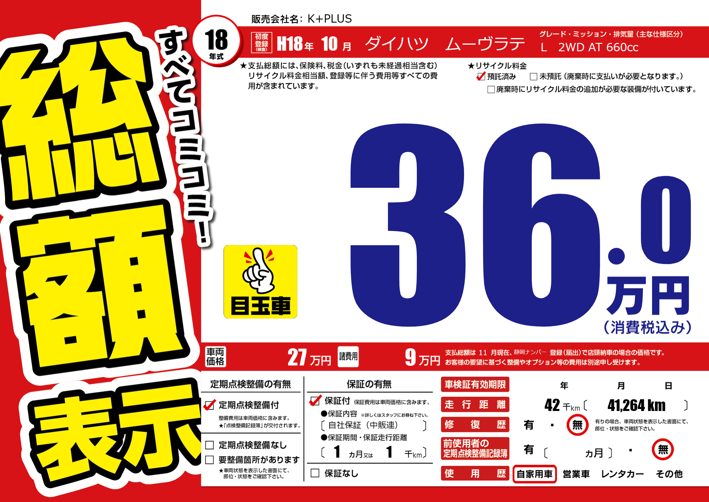 | 走行キロ | 4.2万km | 初年度登録 | H18年10月 |