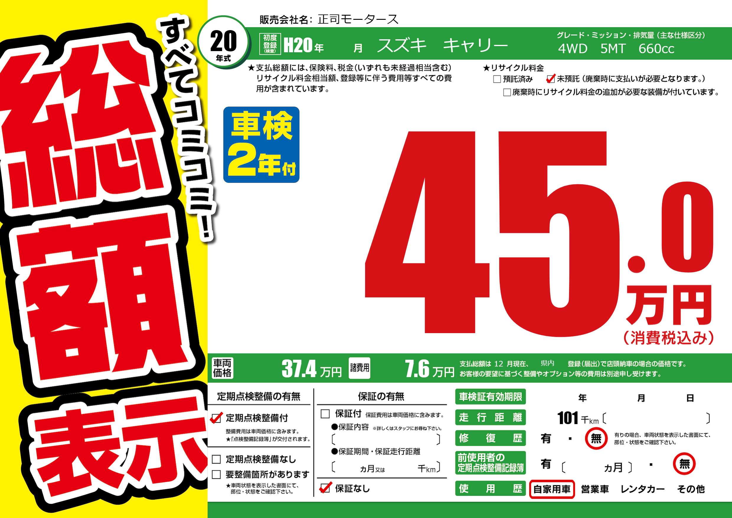| 車名 | スズキ キャリー | グレード ミッション 排気量 |