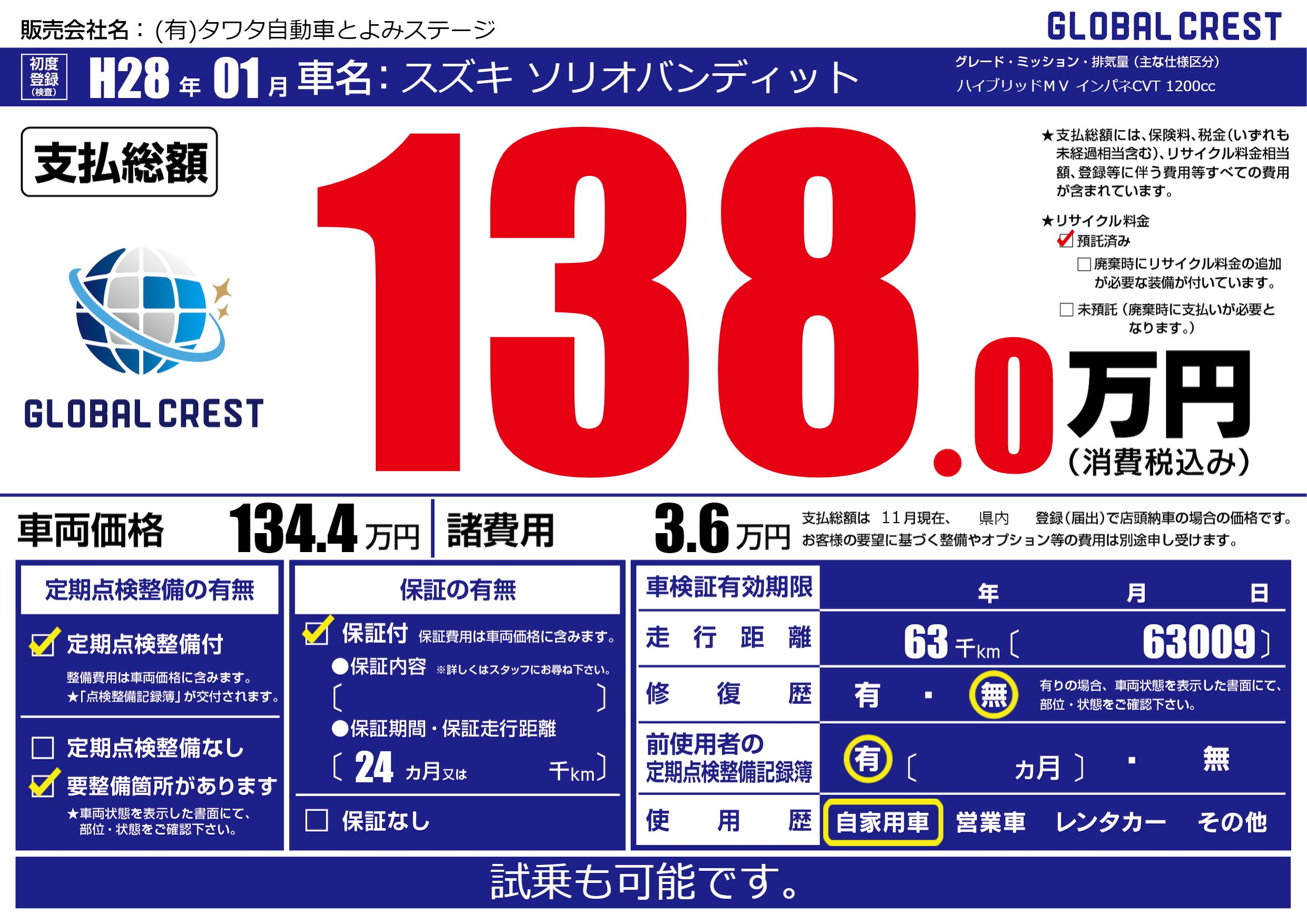 | 走行キロ | 6.3万km | 初年度登録 | H28年01月 |