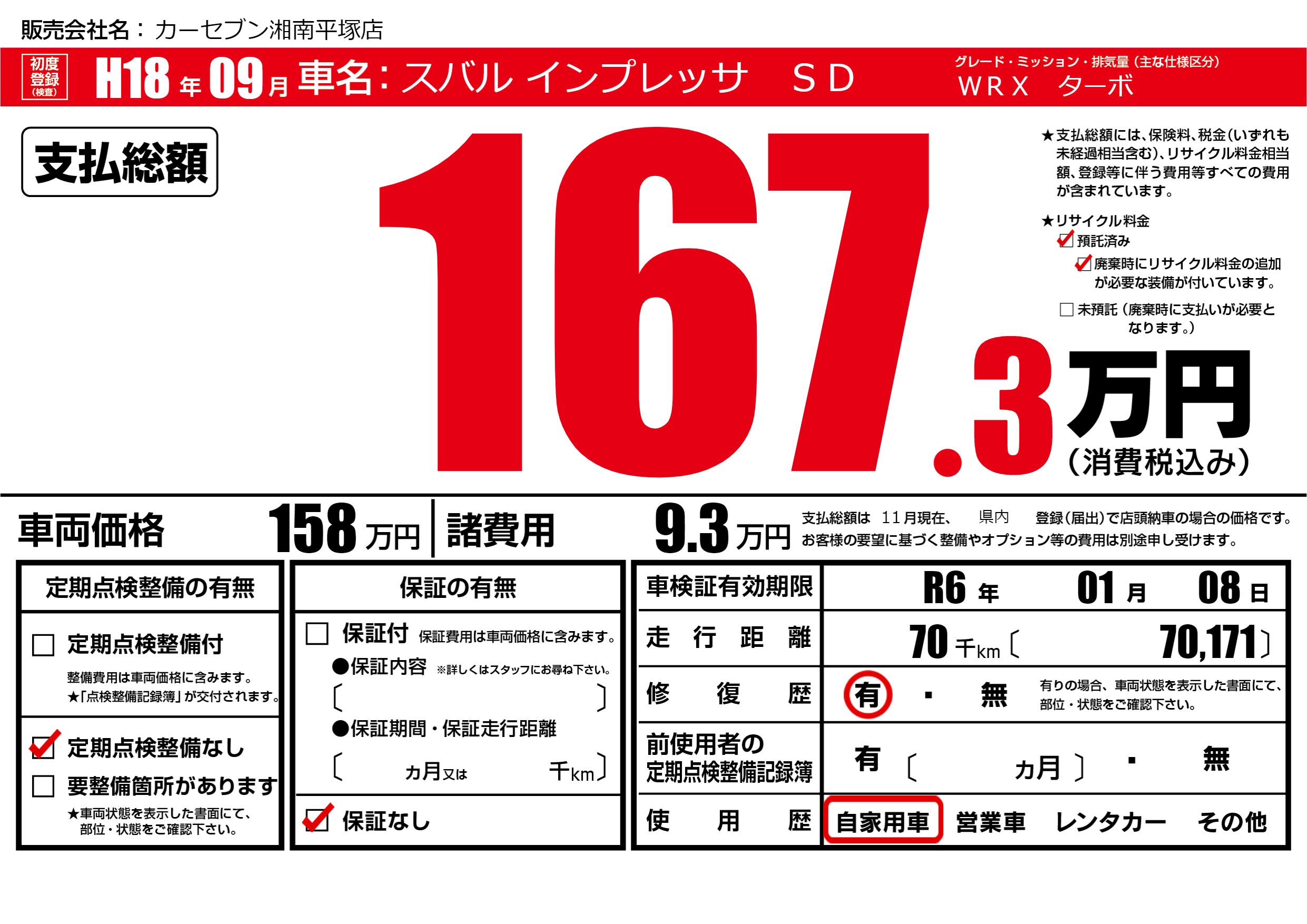 | 走行キロ | 7万km | 初年度登録 | H18年09月 |