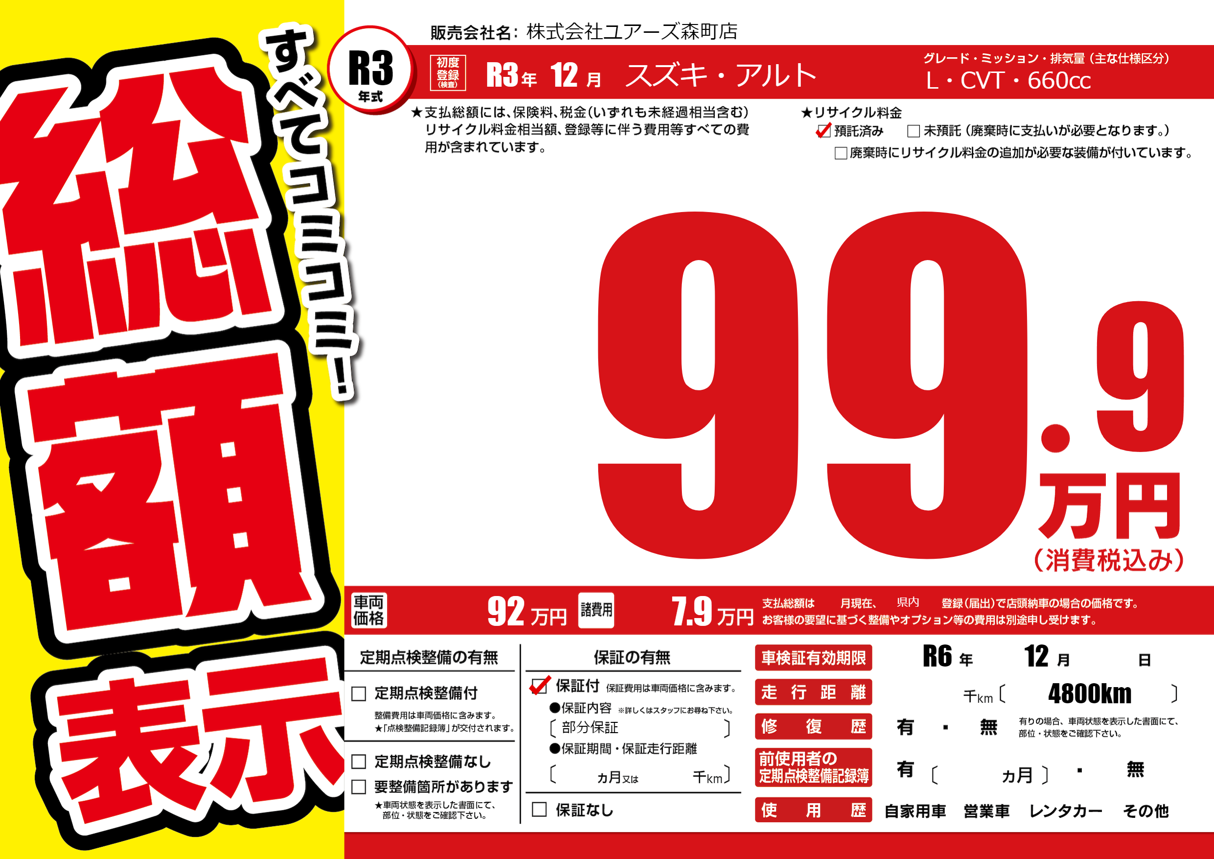 なし | 車検制限 | R6年12月---月 |