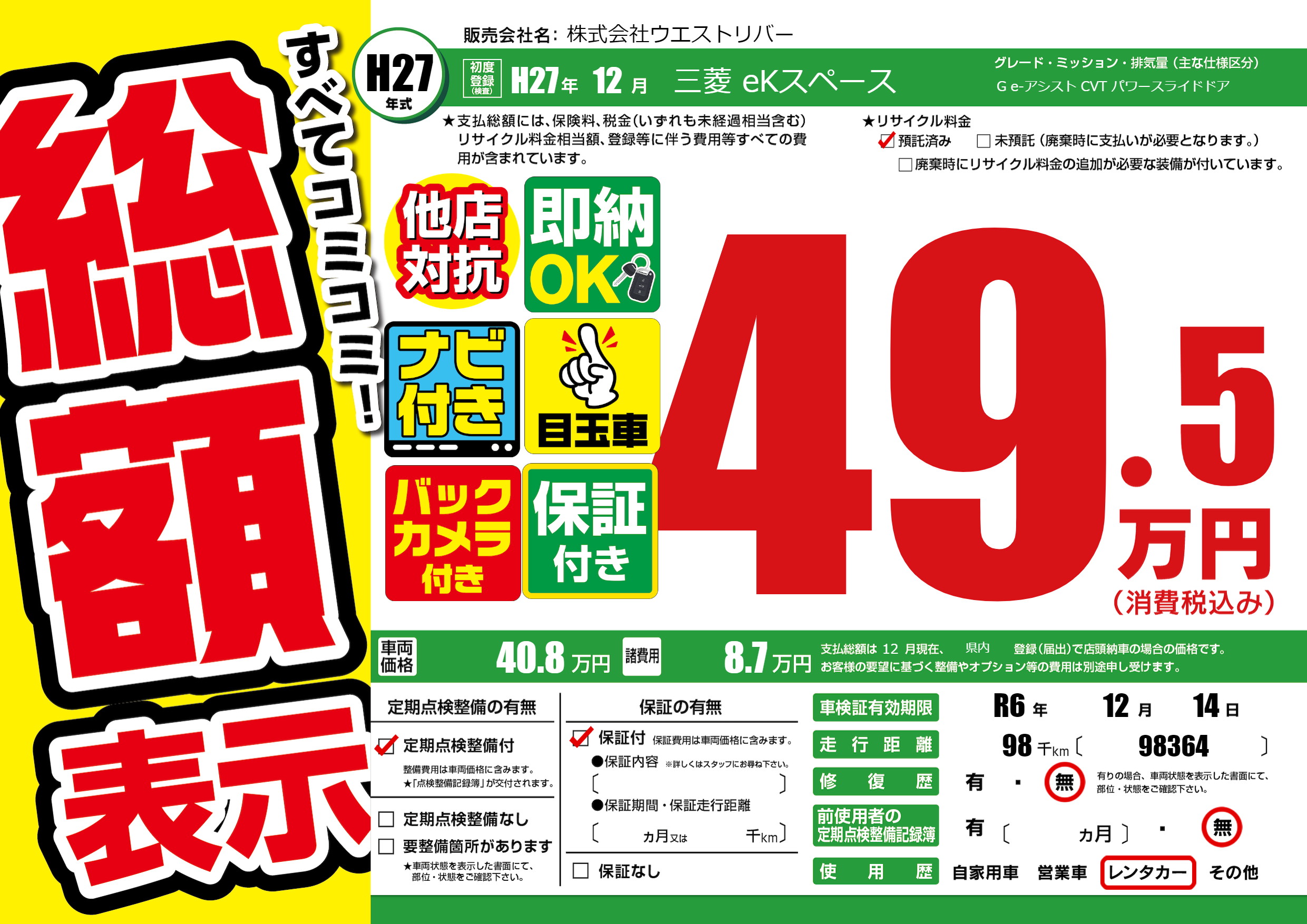 | 車名 | 三菱 eKスペース | グレード ミッション 排気量 |