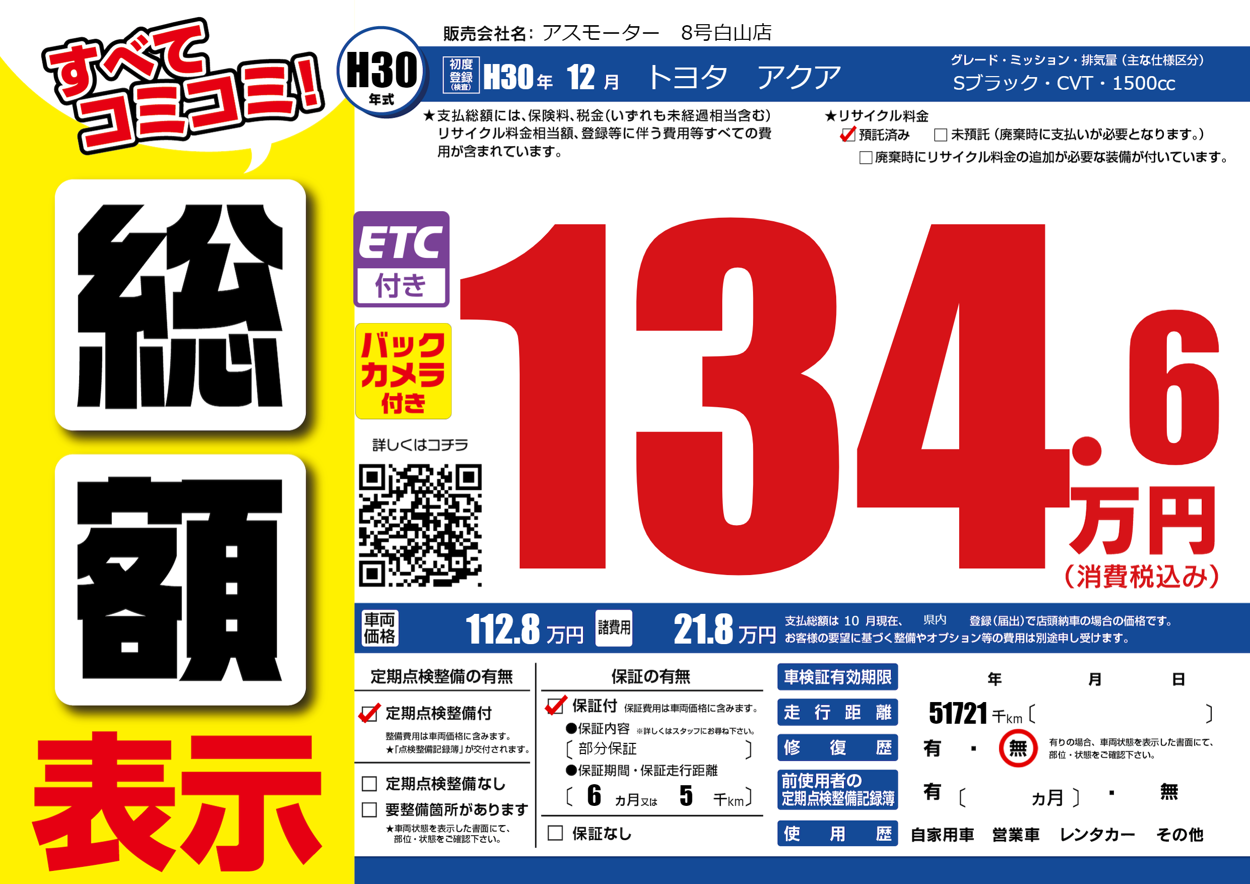 | 車名 | トヨタ アクア | グレード ミッション 排気量 |