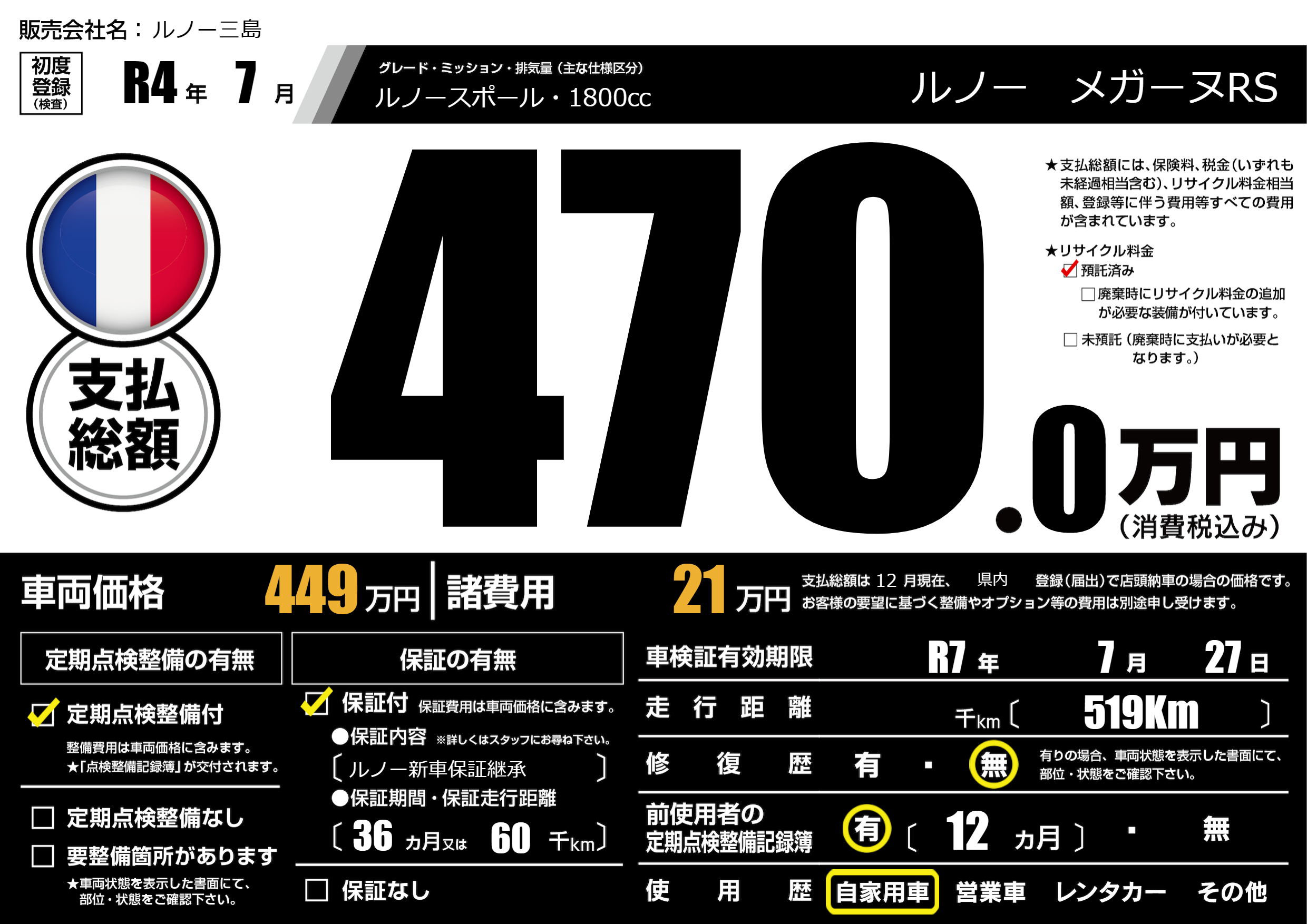 | 車名 | ルノー メガーヌRS | グレード ミッション 排気量 |