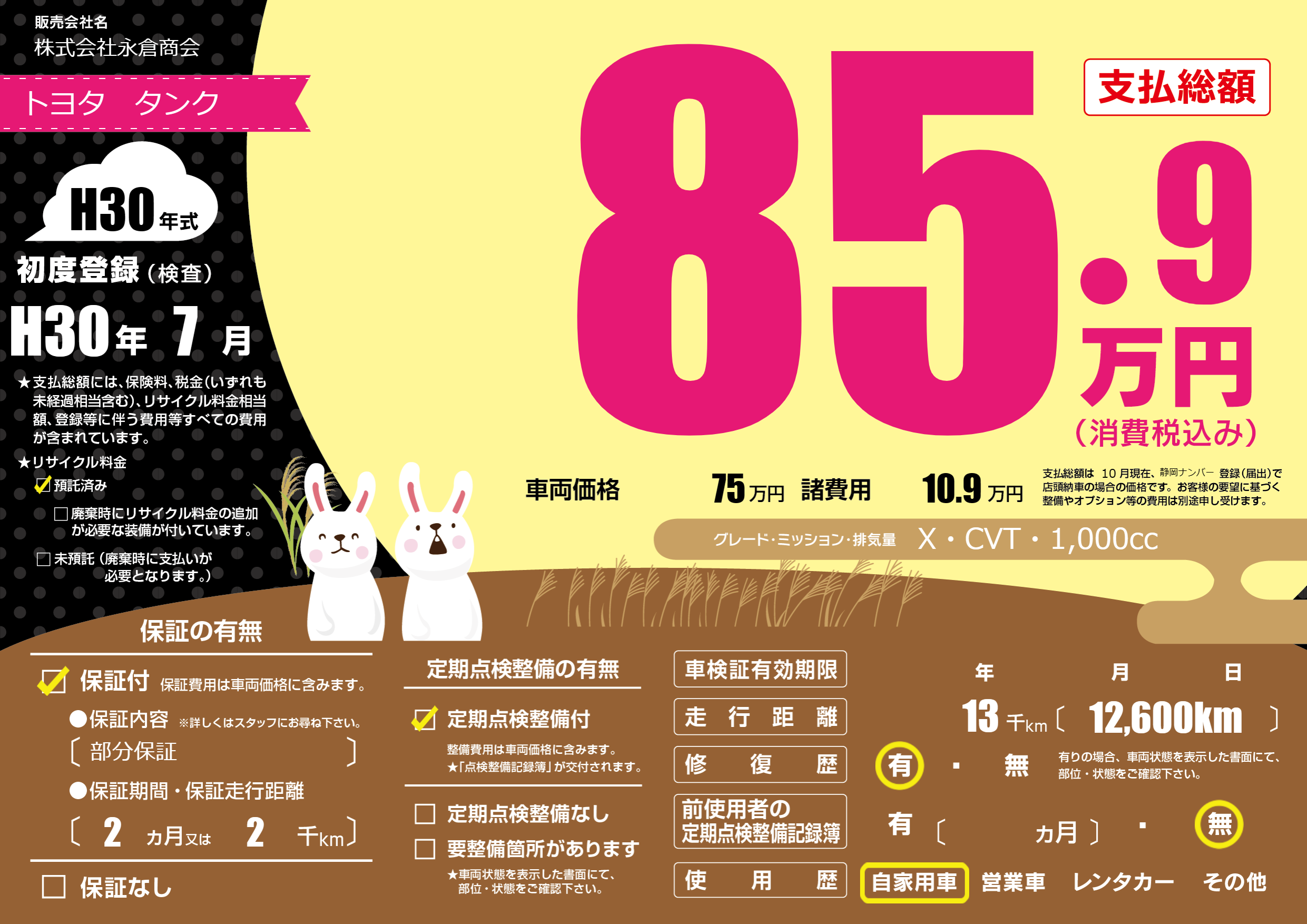 | 車名 | トヨタ タンク | グレード ミッション 排気量 |