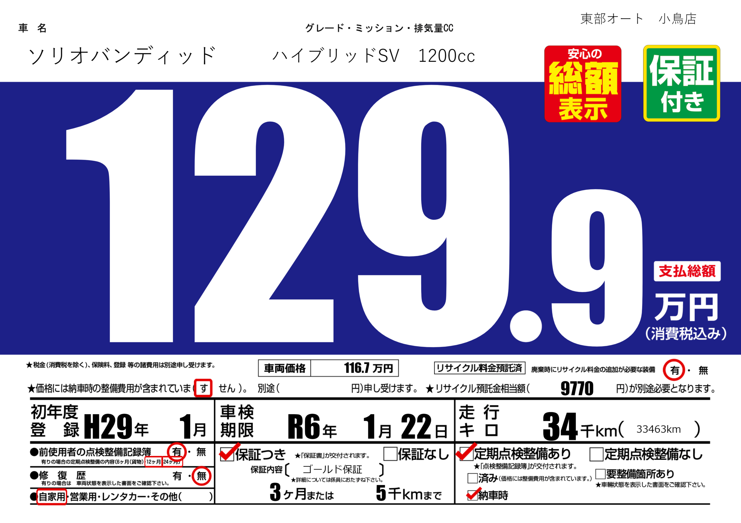 | 定期点検整備 | 定期点検整備あり 納車時あり | ||