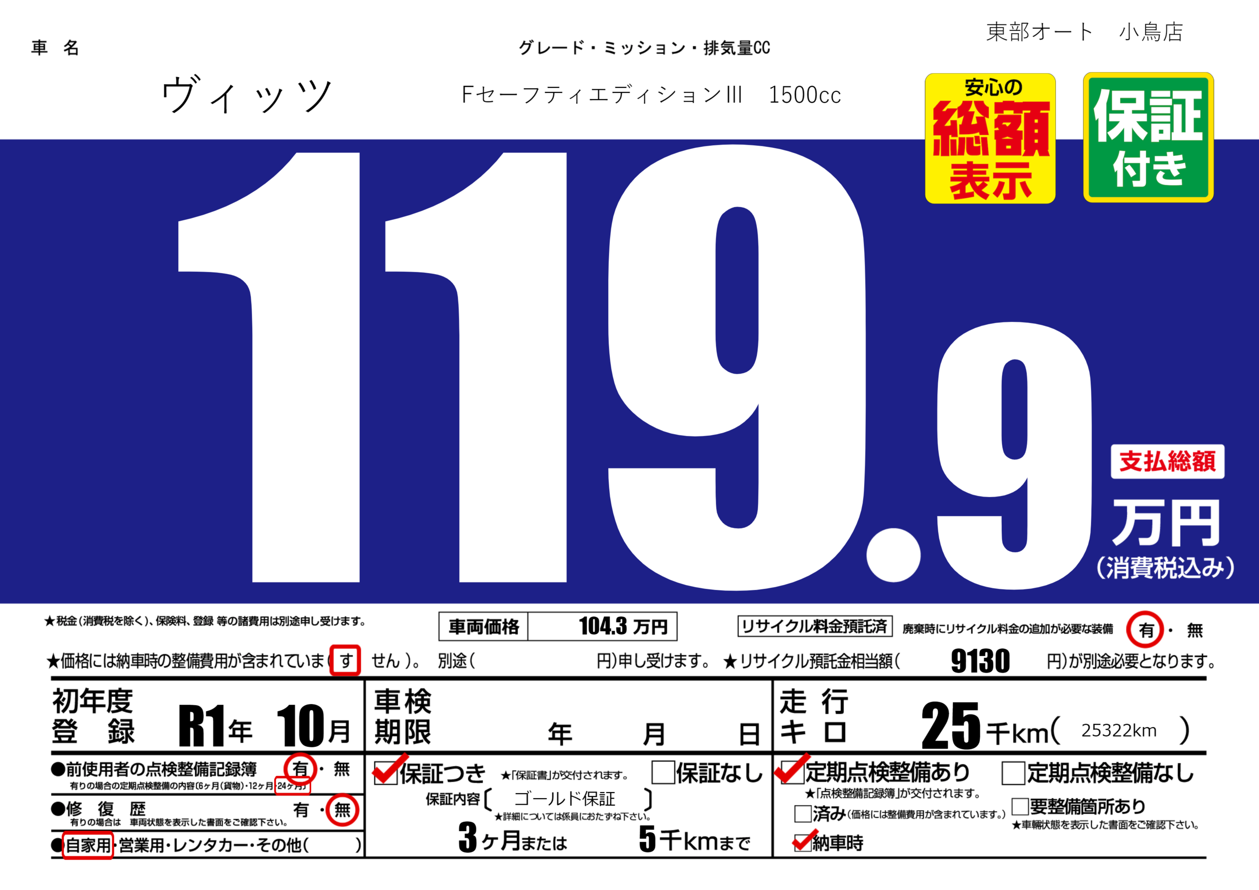 | 車名 | ヴィッツ | グレード ミッション 排気量 |