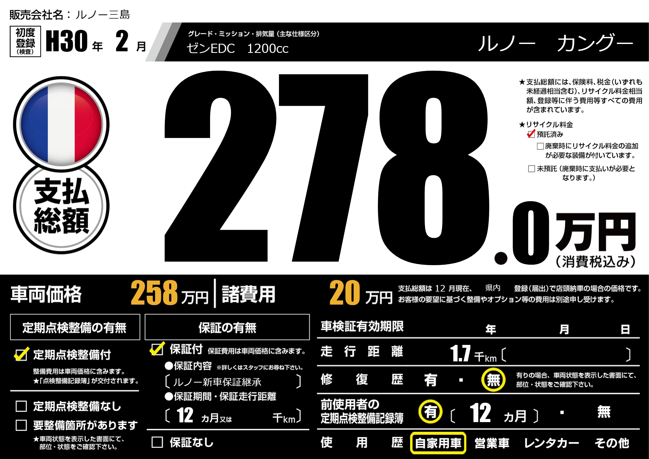 保証なし 保証内容(ルノー新車保証継承) 12ヶ月または千km |