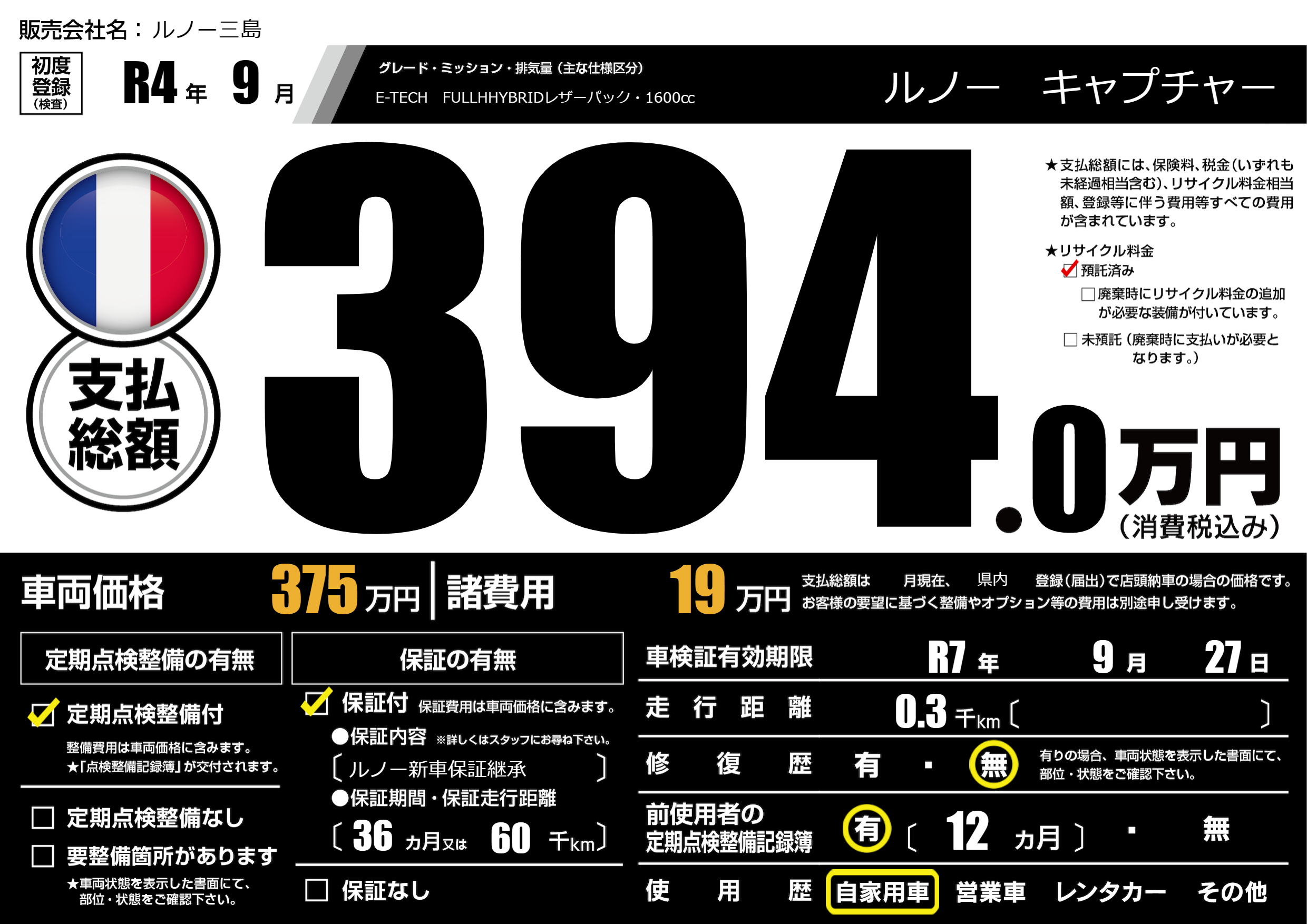 保証なし 保証内容(ルノー新車保証継承) 36ヶ月または(60)千kmまで |