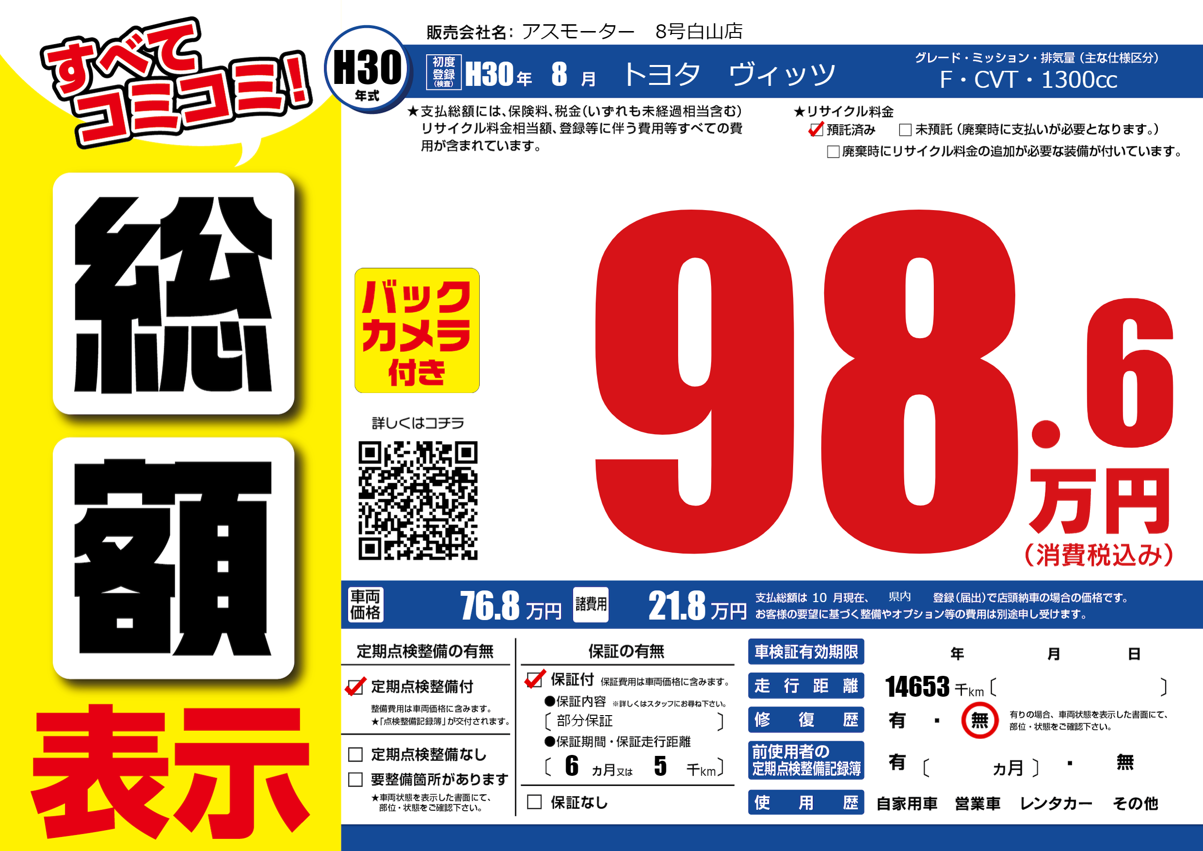 | 車名 | トヨタ ヴィッツ | グレード ミッション 排気量 |