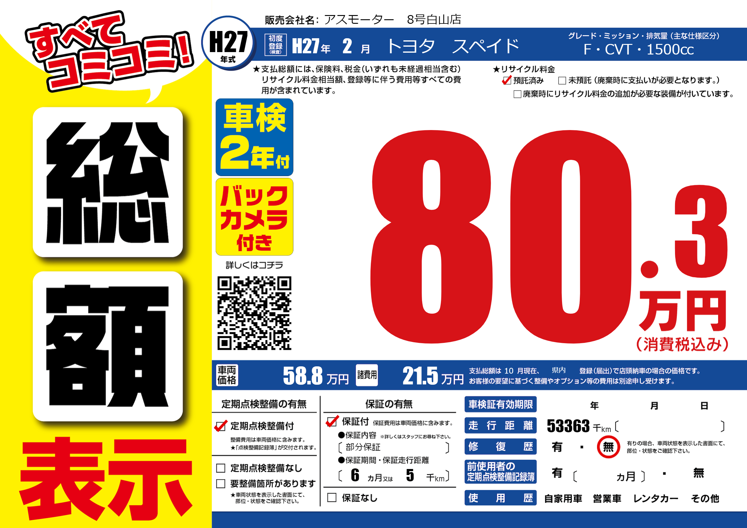 | 車名 | トヨタ スペイド | グレード ミッション 排気量 |