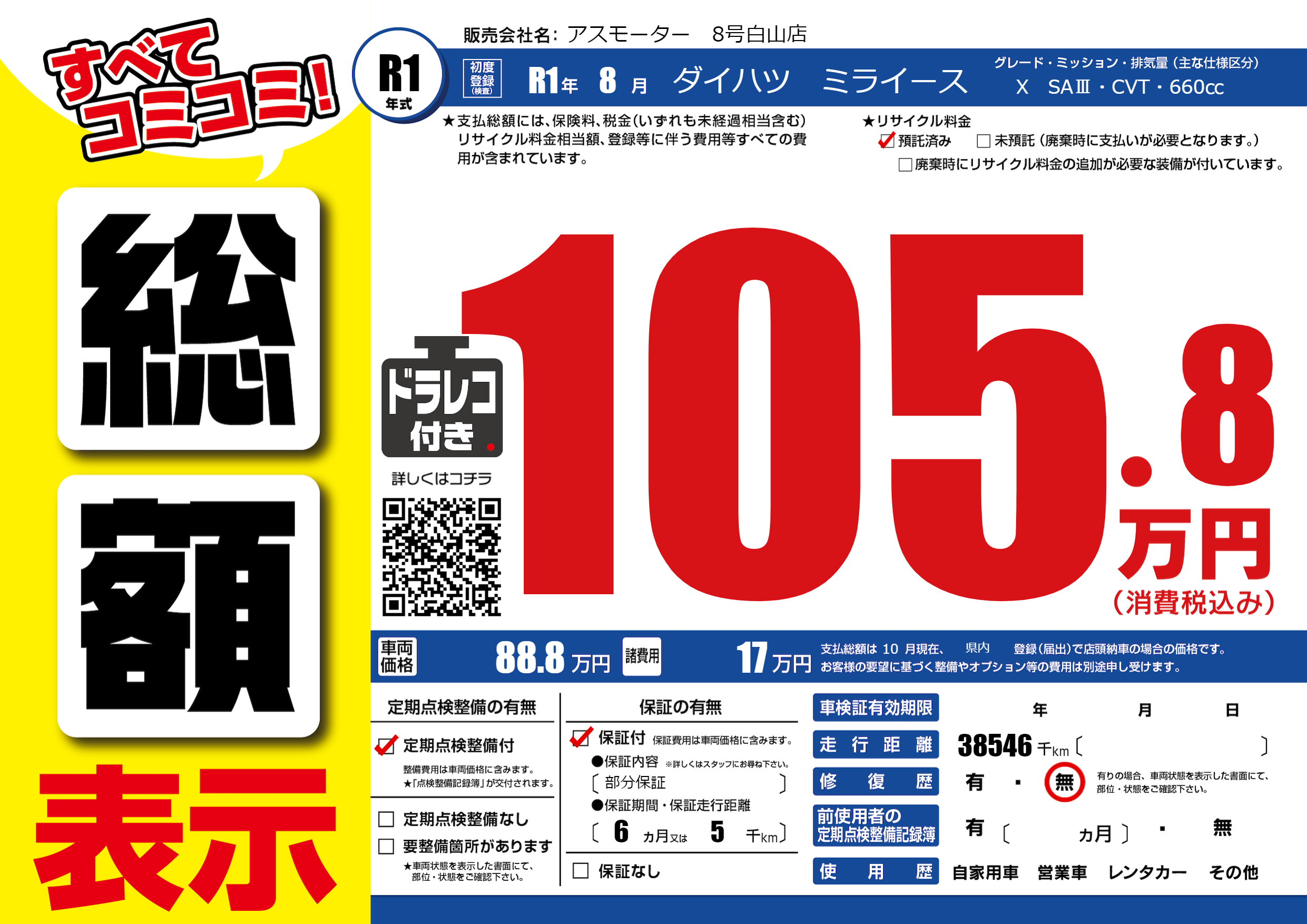| 走行キロ | 3854.6万km | 初年度登録 | R1年8月 |