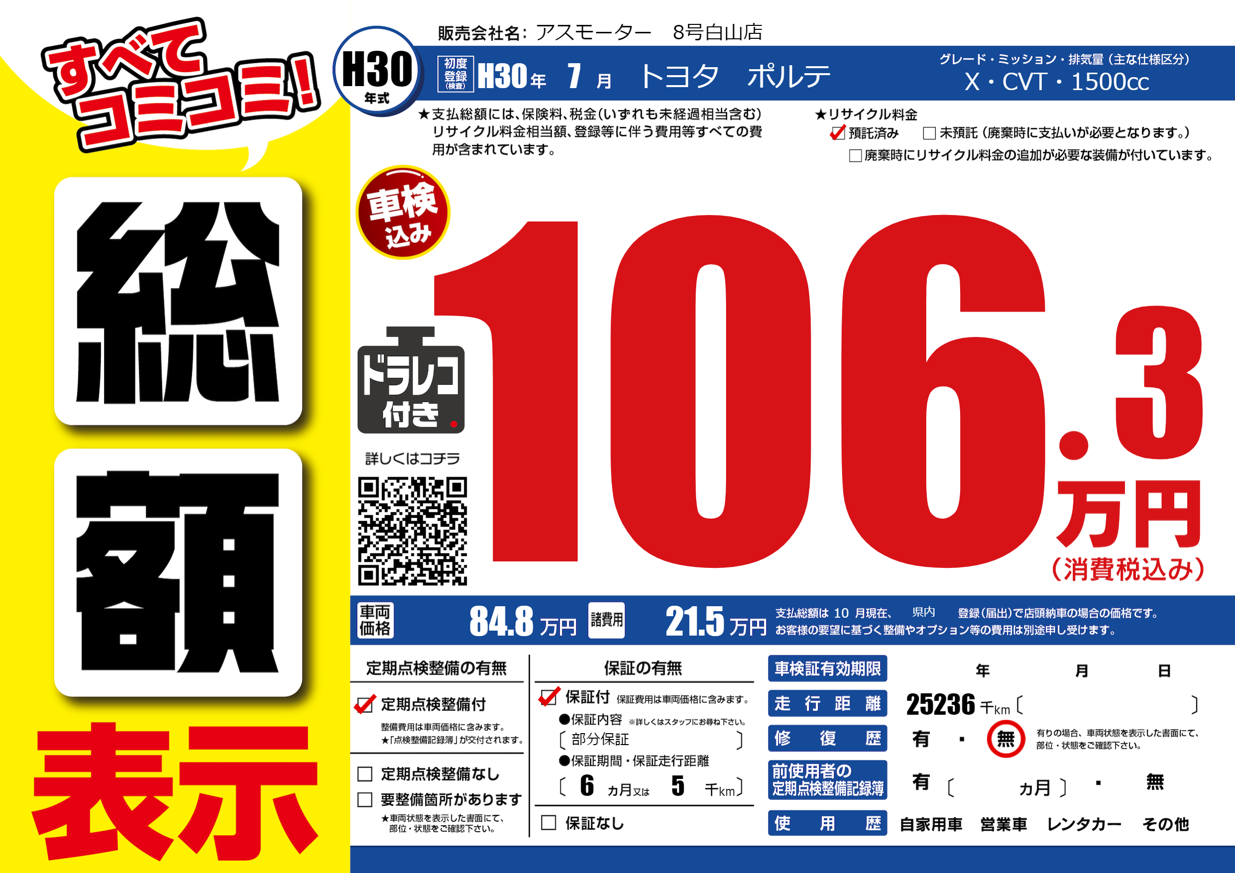 | 車名 | トヨタ ポルテ | グレード ミッション 排気量 |
