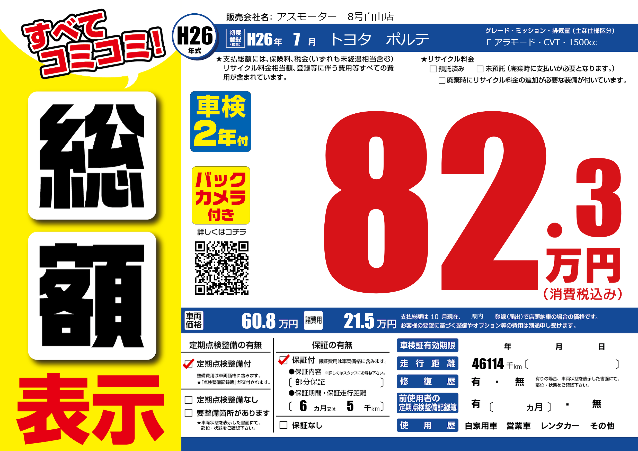 | 車名 | トヨタ ポルテ | グレード ミッション 排気量 |