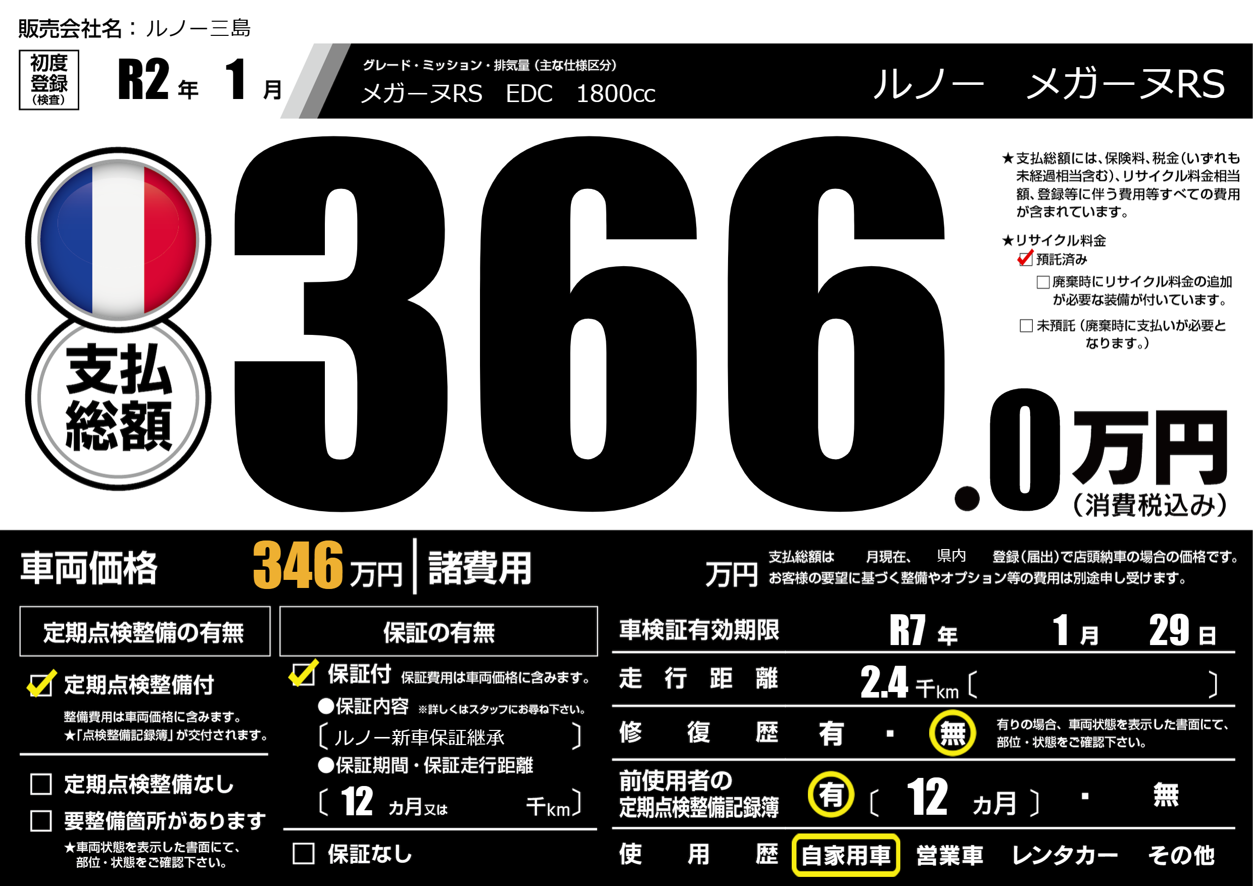 保証なし 保証内容(ルノー新車保証継承) 12ヶ月または千km |