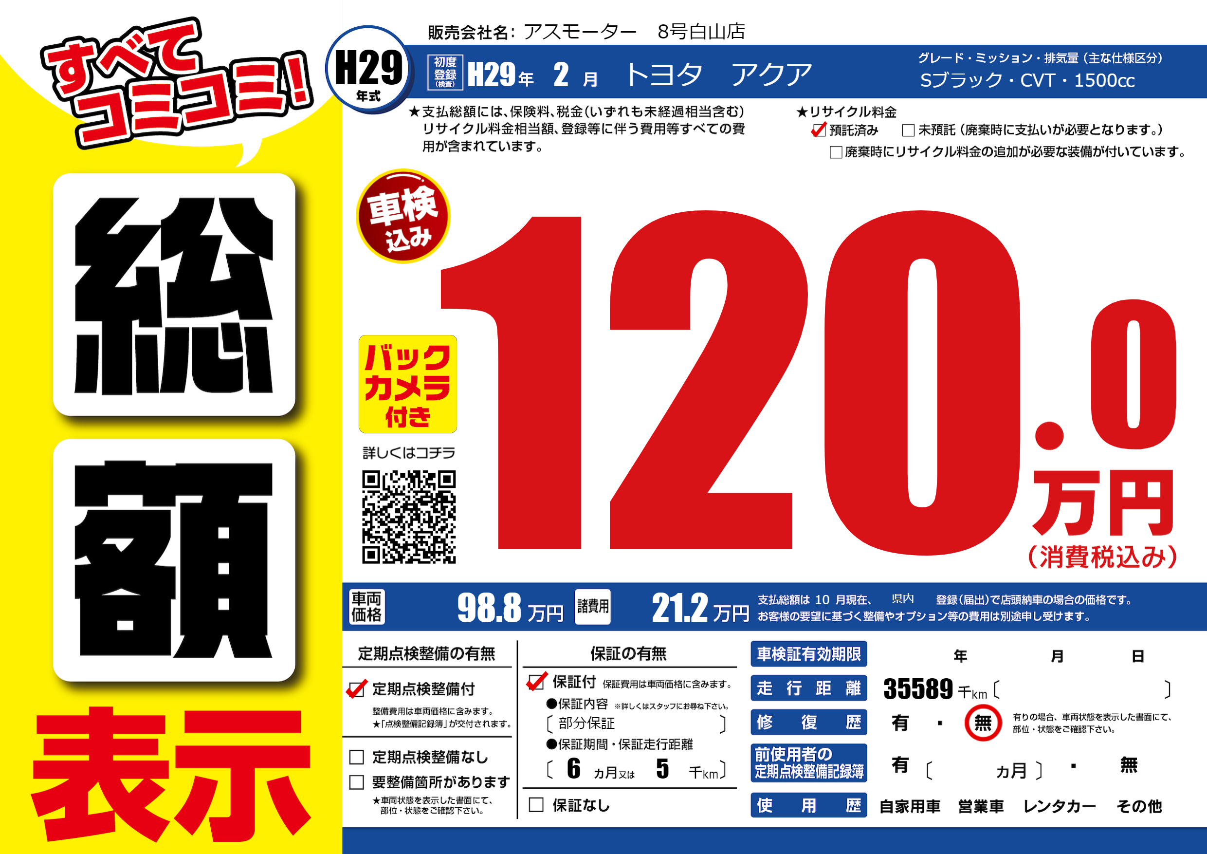 | 走行キロ | 3558.9万km | 初年度登録 | H29年2月 |