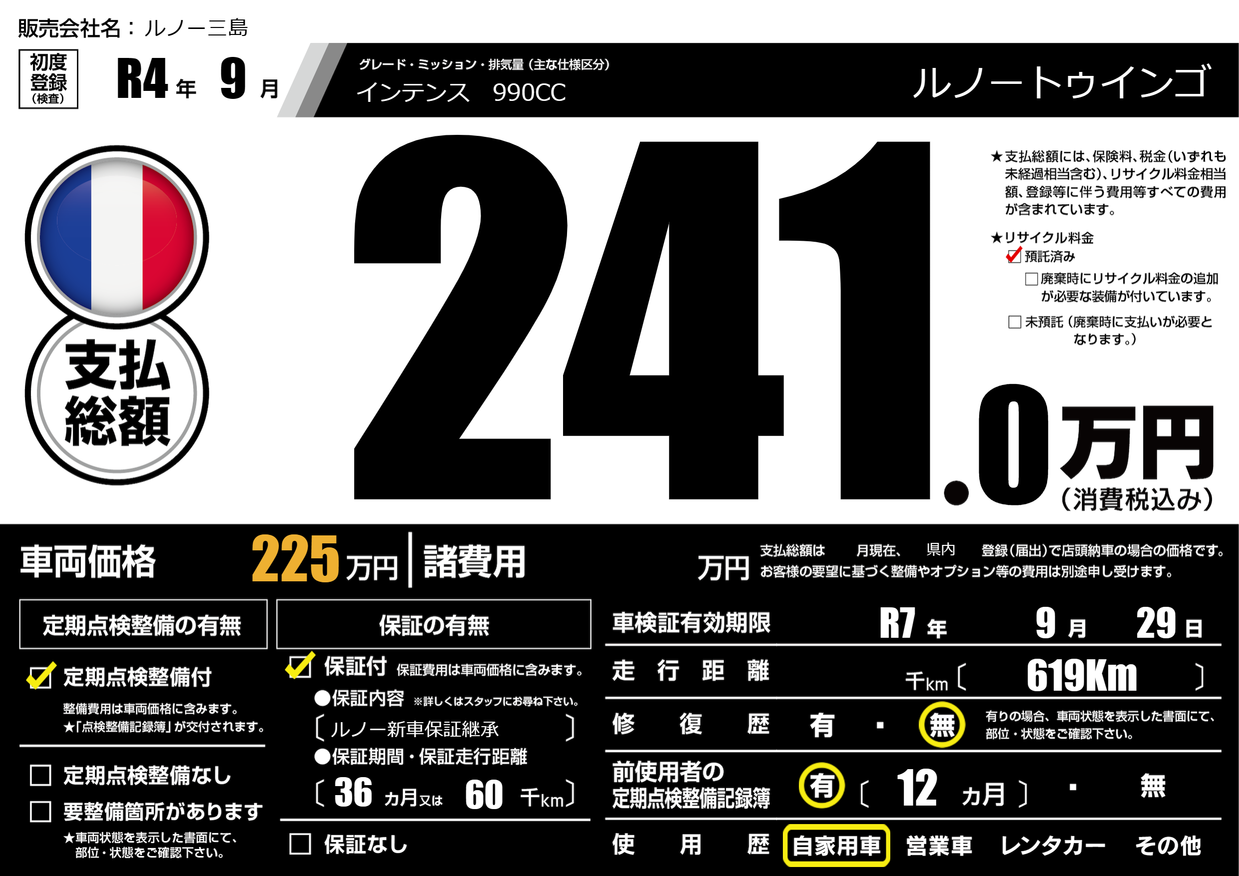 保証なし 保証内容(ルノー新車保証継承) 36ヶ月または(60)千kmまで |