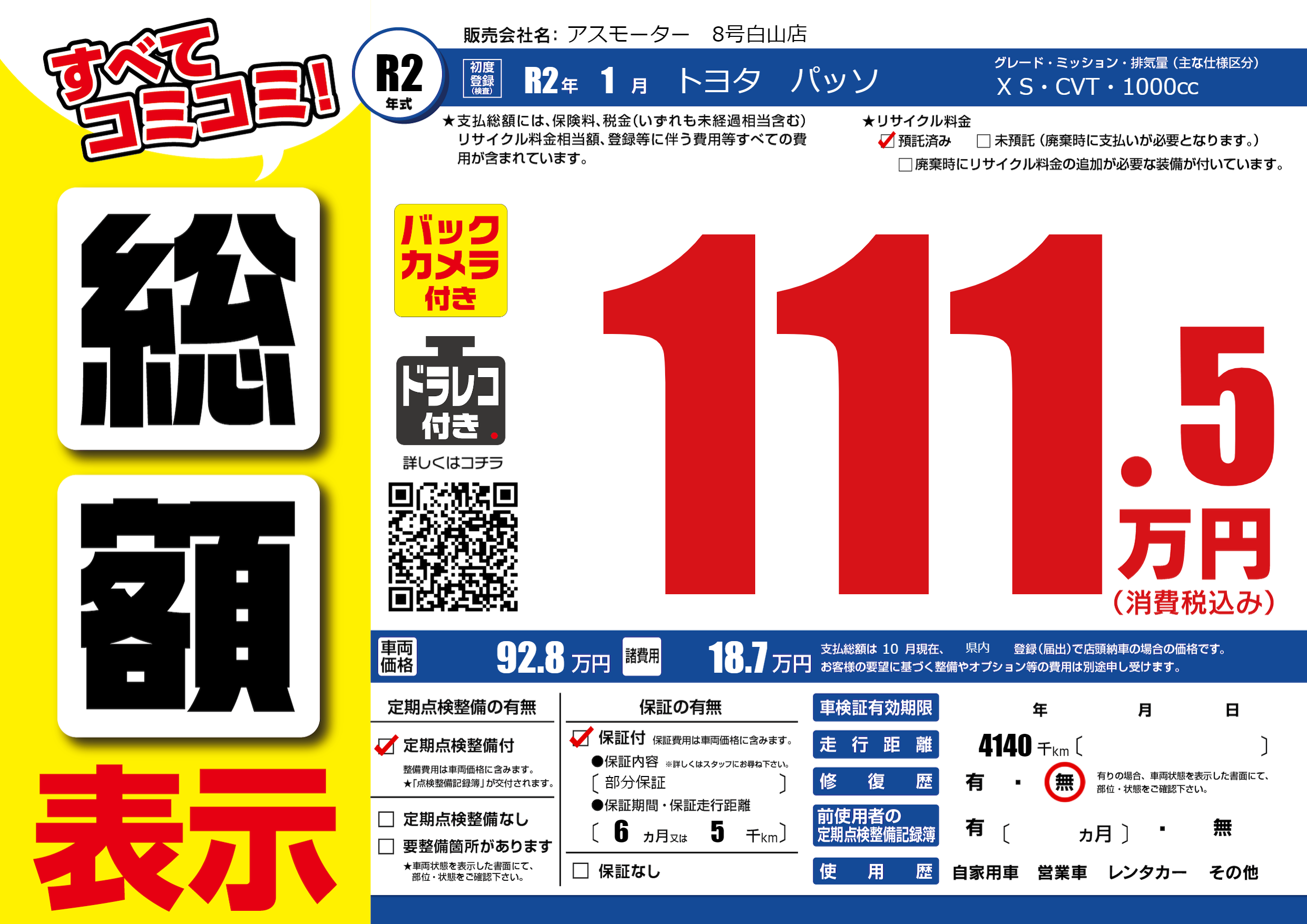 | 車名 | トヨタ パッソ | グレード ミッション 排気量 |